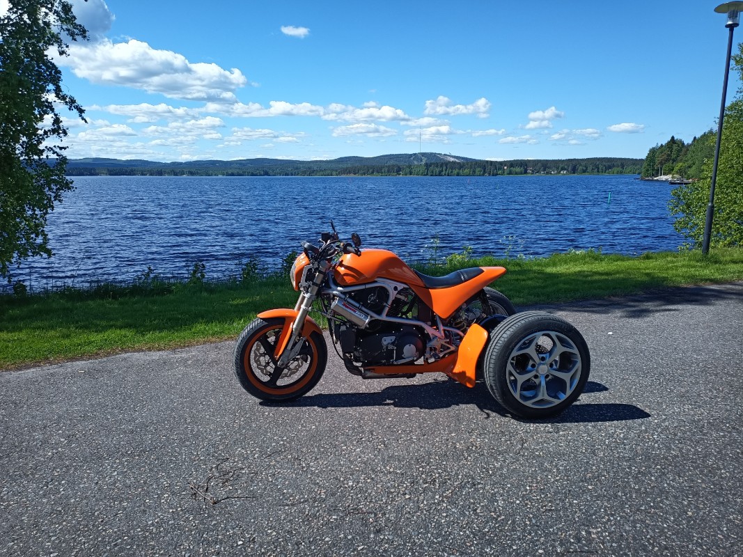Pour les connaisseurs, c'était au départ un Buell S1 Lightning de 96, converti en trike en 2010 avec en prime un moteur de XB12, 1200 cm3. ECU "course", échappement sport, ~100ch sans doute.