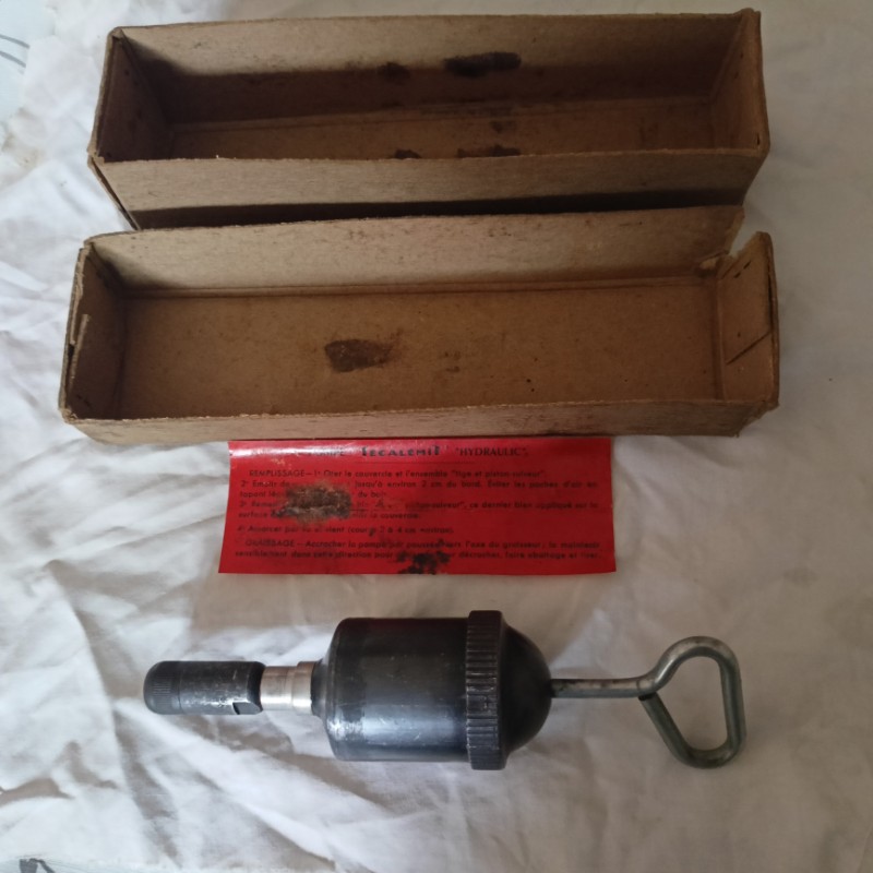 Dernière acquisition : la même pompe que celle de Denis, avec sa boîte et la notice (un peu tachée) à part. La plupart des pompes vues avec le lot de bord n'étaient pas en boîte et la notice était pliée en deux et fixée autour du corps de la pompe avec une sorte de papier craft.... celle avec la boîte était peut être commercialisée à part?