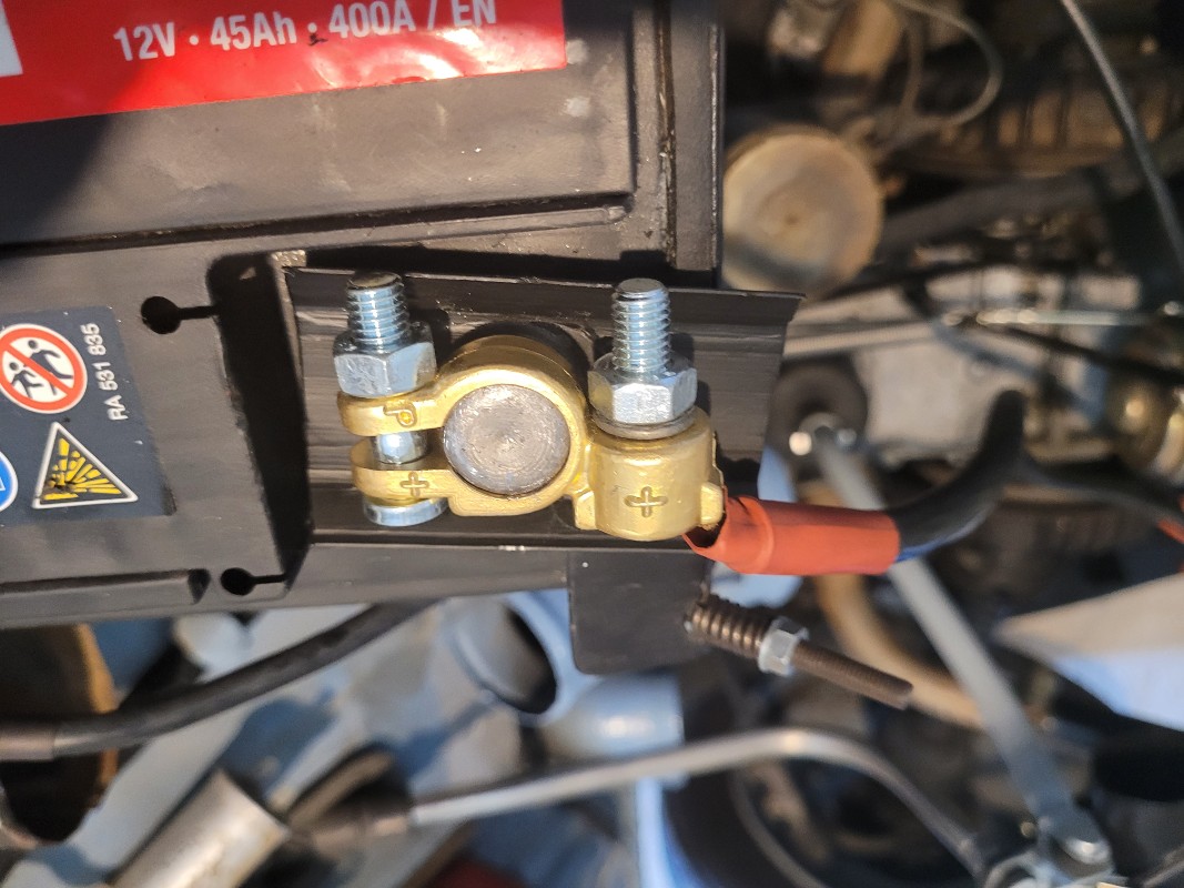 Suivant les conseils de @CHARLYSTONE , j'ai mis cette plaquette en plastique en attendant mieux.Pat_finlande a écrit : ↑17 juin 2023, 09:10Pour ma part j'ai mis une chambre a air autour de la barre de maintien de la batterie. Pourquoi, me direz-vous? eh ben la seule fois que j'ai essaye de "booster" Violette, la pince du + a glisse un peu, et bimbadaboom, joli feu d'artifice sous le capot, et de la fumee dans l'habitacle. J'ai bien cru que la 2CV allait finir en cendres, mais miracle, tout fonctionne toujours!CHARLYSTONE a écrit : ↑11 juin 2023, 19:17 Bonjour tu viens de faire une petite révision sur la connexion, c'est très bien, par contre, mets un isolant,une plaque en plastique, entre la borne pluset la cosse du câble, afin de ne pas faire de cour circuit avec le support de la batterie