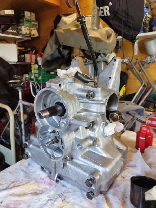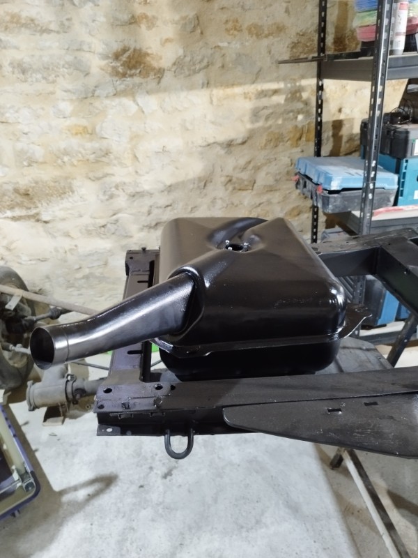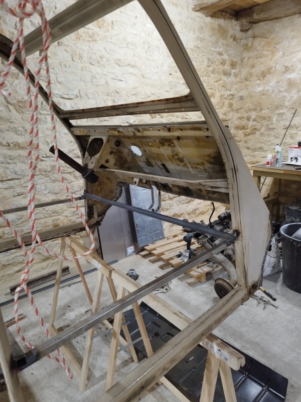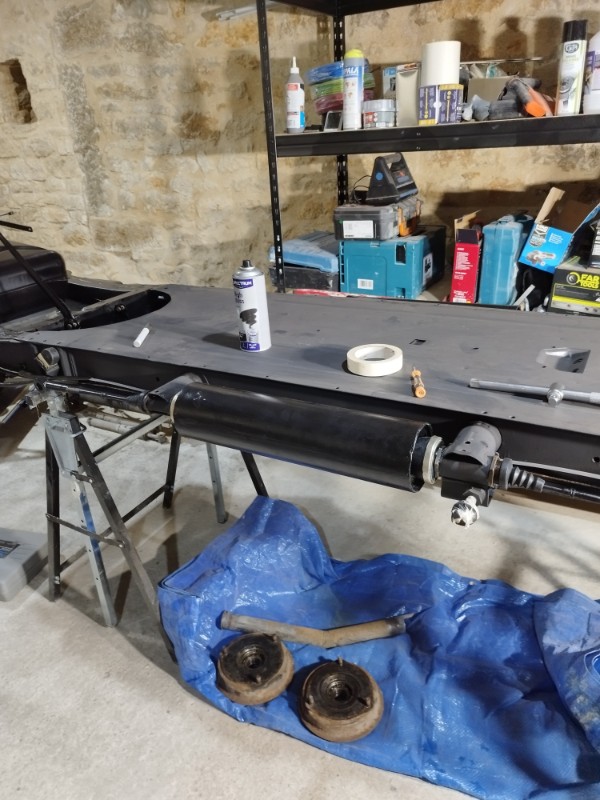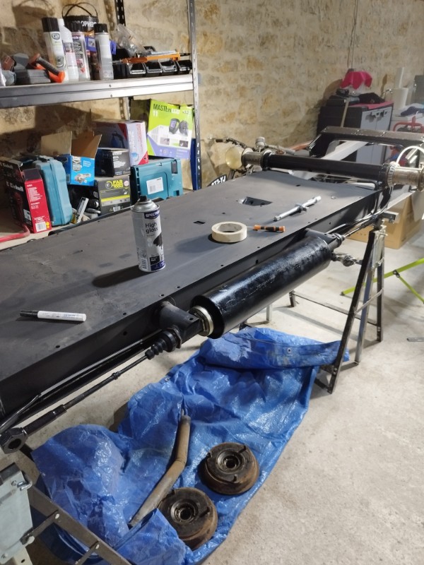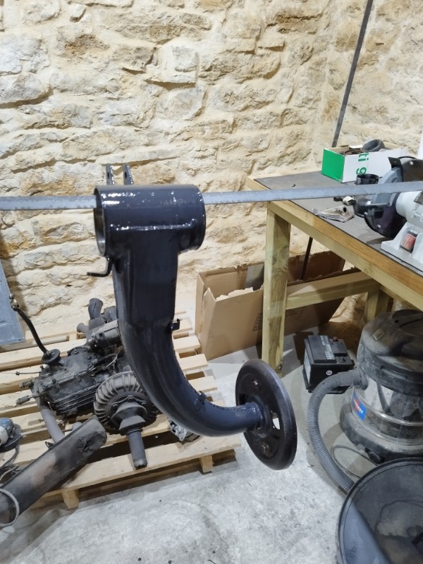 De retour de vacances j'ai donc laissé le chantier de la caisse dans ma grange, après avoir terminé le châssis et l'essieu arrière, je suis donc remonté avec dans le coffre moteur et boite, ici j'ai que 15m2 pour bosser, c'est plus la même !!!!