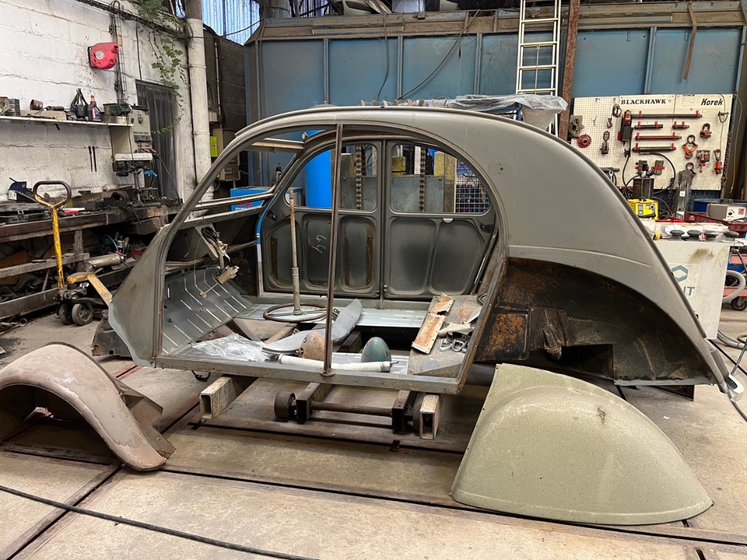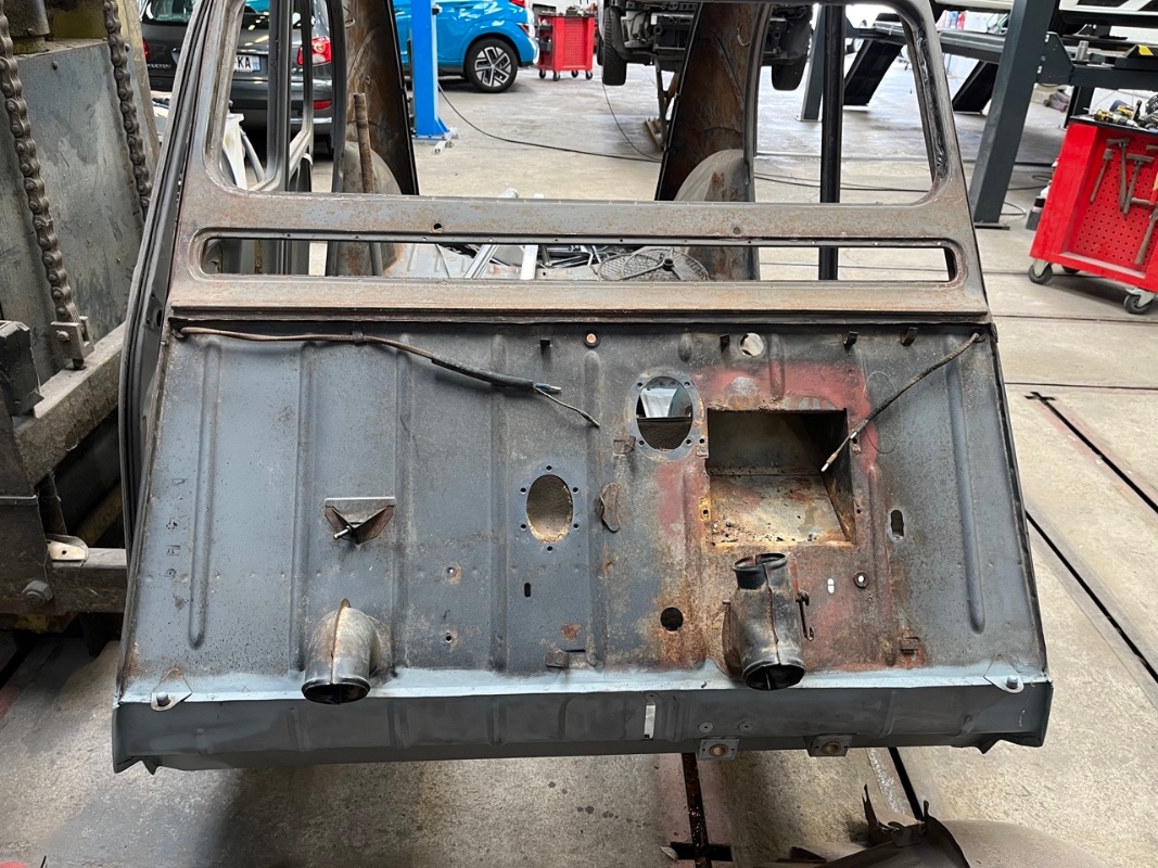 La 2cv a été entièrement démontée, châssis réparé et ainsi conservé, il était plutôt en bon état en réalité. Les parties mécanique moteur-boite-embrayage, trains roulants et système de freinage entièrement revus. Quelques éléments de carrosserie, capot, portes avant et ailes arrière déjà préparés chez le même carrossier que je fais travailler.
