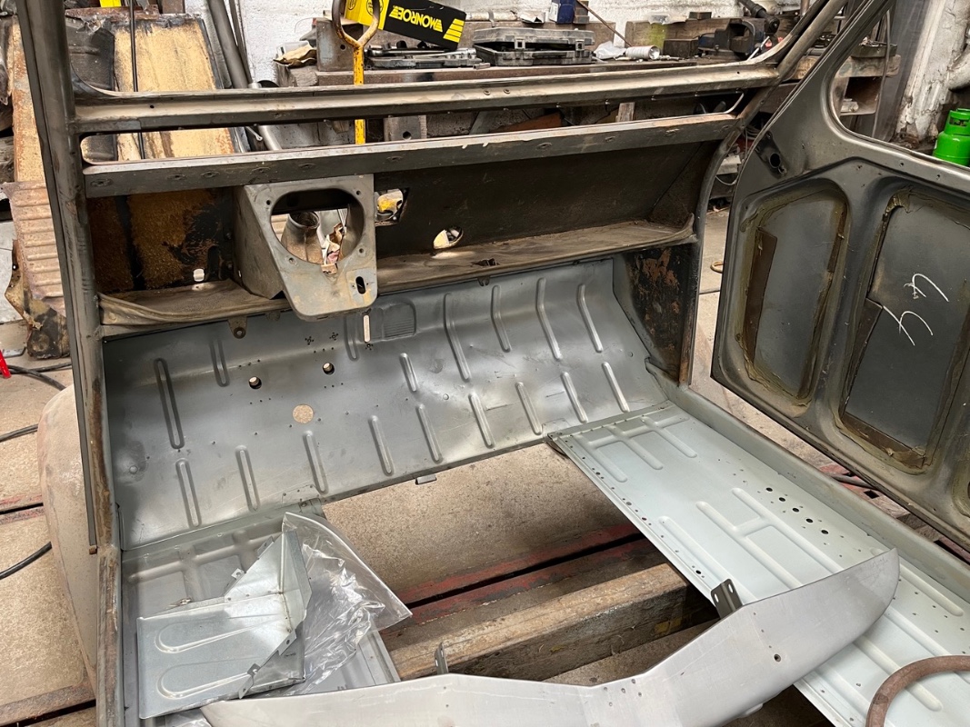Les travaux sont débutés, nous décidons de changer les 2 planchers latéraux, le plancher pédalier et le fond de coffre. Le reste des éléments de carrosserie, ailes, portes et capot sont en bon état. Seul le hayon de malle arrière est à remplacer, ou pas....??