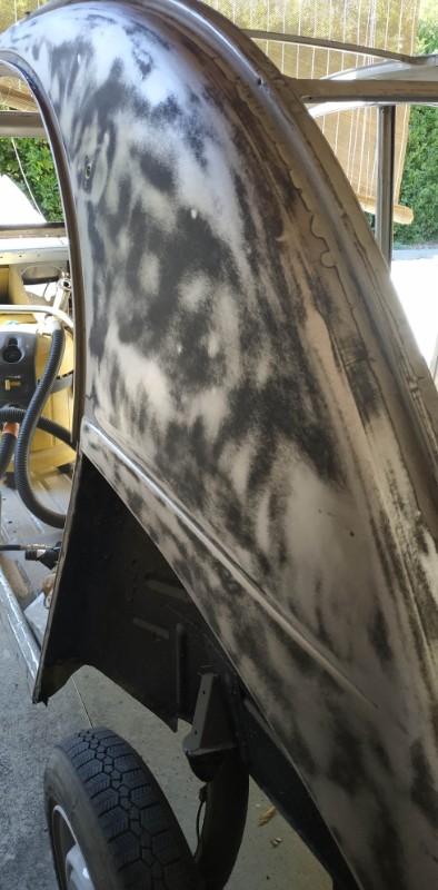 Ce matin, on a mis en apprêt les 4 portes (int/ext), une partie des ailes avant et le fond de coffre.