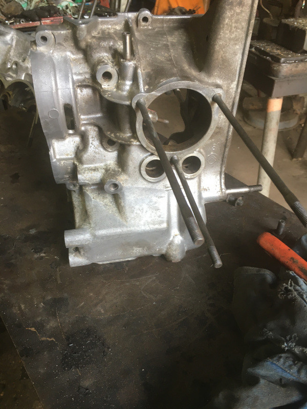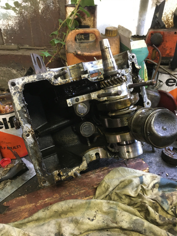 J'ai quand même remplacé les dés de guidage, plutôt usés. Aujourd'hui, je me suis attaqué au moteur : ouverture des carters, dépose de l'arbre à cames et du vilebrequin, avec la pompe à huile. Nettoyage des carters (long et fastidieux, j'étais content quand ça a été fini !)