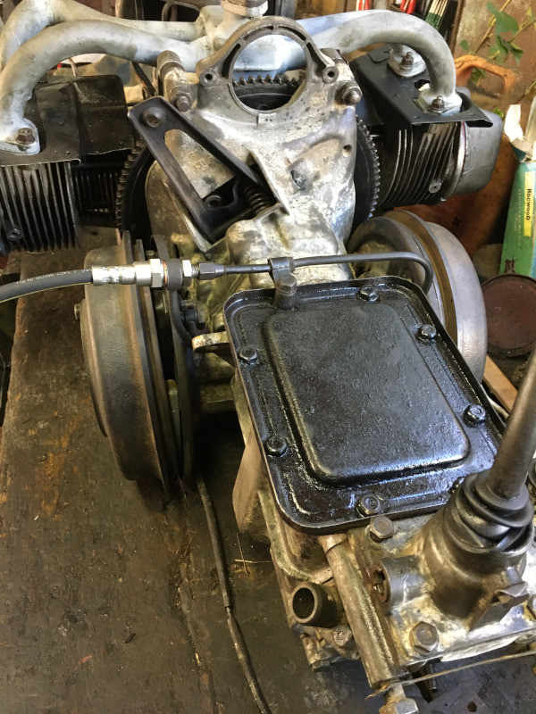 Ce matin, j'ai vidangé et nettoyé l'extérieur de la boite de vitesses. Elle contenait de l'huile (bien sale, mais il y en avait !) J'ai assemblé le moteur avec la boîte de vitesses "à blanc", pour pouvoir monter un démarreur et faire tourner le moteur pour contrôler la pression d'huile... Enfin, s'il n'y avait pas de (grosses) fuites, et l'huile montait aux culbuteurs..
