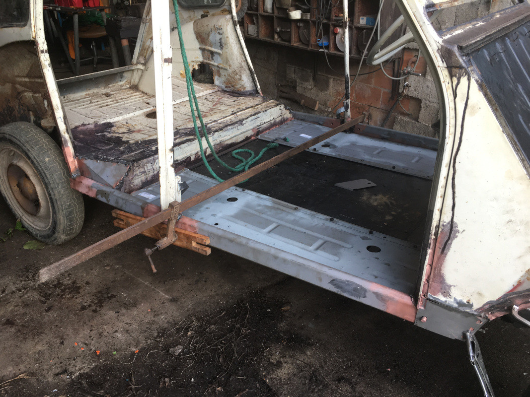 Cela ne m'inquiète pas outre mesure, car je dois pouvoir agir légèrement sur les bas de caisse avec une clé anglaise longue, en intercalant des cales en bois, pour essayer de tordre les tôles un peu en arrière.