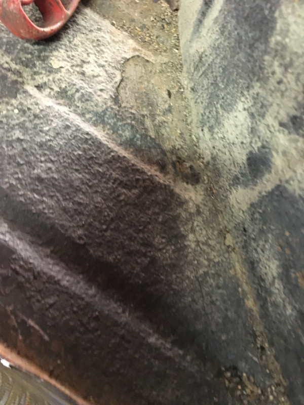 On peut voir la tôle, ici saine, une fois l'enduit bitumeux soulevé..