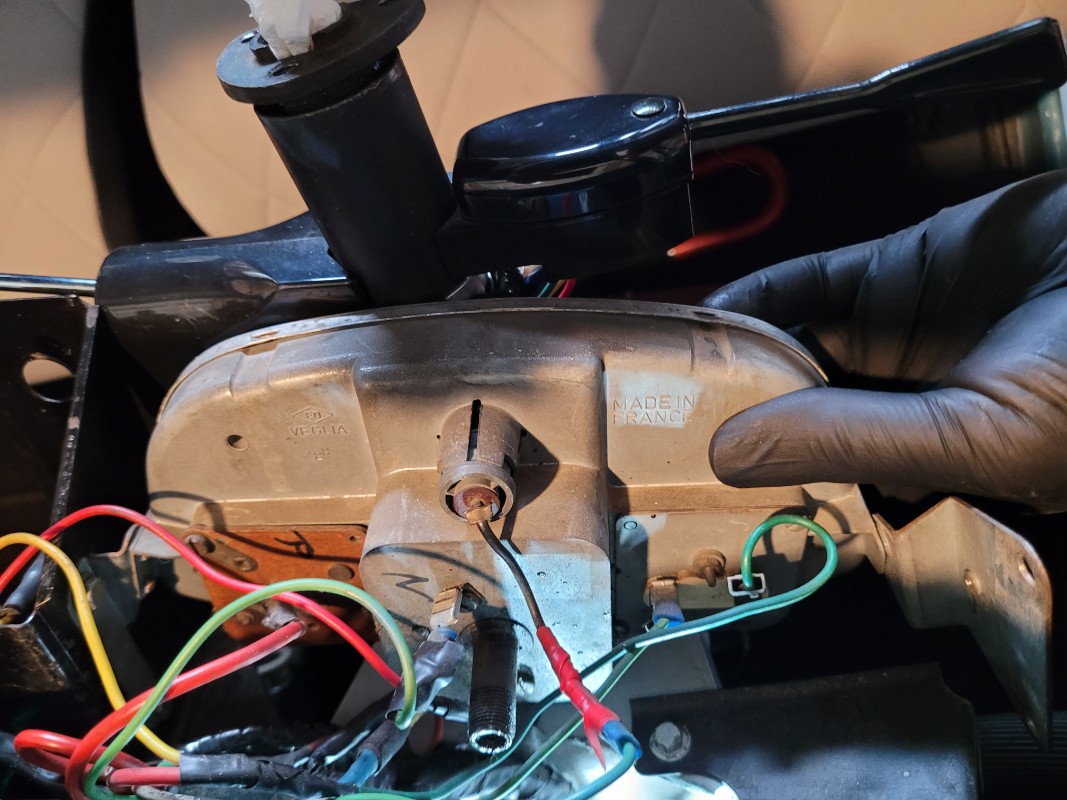 J'étais embêté, car mon commodo de clignotants ne faisait pas de bruits, ni ma centrale, je ne savais pas quand mes clignotants étaient en marche, donc j'ai mis un commodo avec bruiteur intégré et j'ai bidouillé un système pour avoir un rappel visuel vu dans un 2cv Xpert. Cela explique la petite loupiote au dessus du commodo.