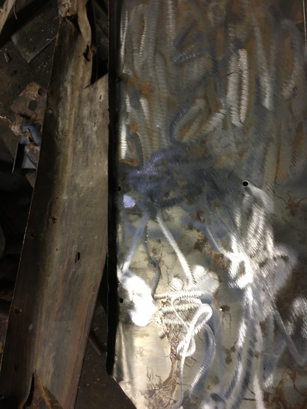 En suivant, je mastiquerai les ondulations des tôles d'origine, à leur liaison avec les tôles plates, ainsi que les soudures alentours.