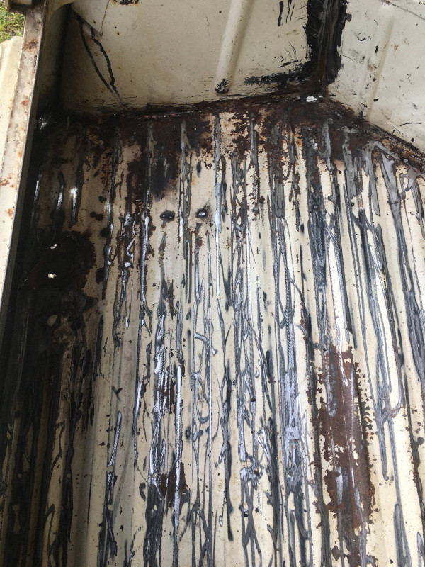 L'outil, branché, avec sa réserve d'huile : Le fond, gratté mais bien rouillé. J'ai réussi à décoller l'ancien mastic d'étanchéité, en m'aidant du décapeur thermique, qui, une fois de plus, a fait des merveilles. Ensuite, j'ai passé du FEROSE au pinceau : En insistant dans les angles : Au fond, le produit commence à sécher : Vue d'ensemble, FEROSE presque sec : Je vais laisser sécher plusieurs jours, avant de repasser une autre couche de FEROSE, puis de mastiquer, préalablement au recouvrement avec un apprêt garnissant.