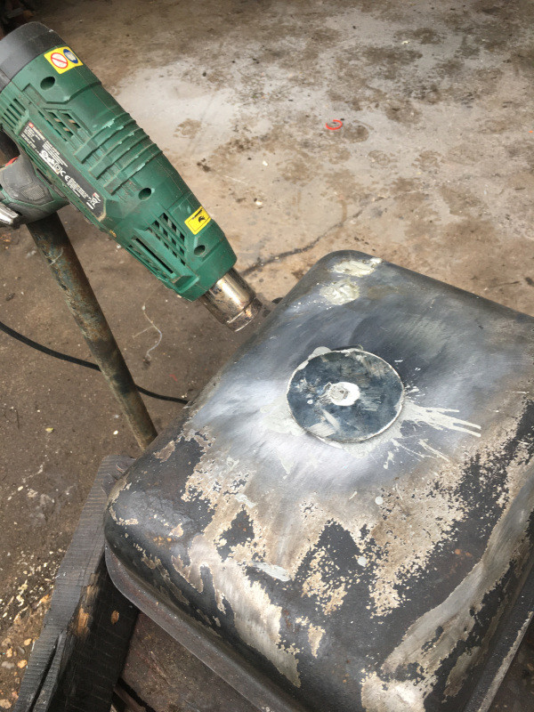 J'ai donc soudé une tôle, découpée dans un couvercle de bidon d'huile : J'ai utilisé ce décapant : J'ai commencé par meuler avec la petite fraise qui va très bien (outil LIDL !) Chauffage à l'aide du décapeur thermique LIDL : Résultats : Il faut encore que je finisse les soudures. Pour cela, il faudrait que je puisse appuyer sur la tôle pour la tenir plaquée contre le réservoir, afin de chauffer l'ensemble le plus uniformément possible.