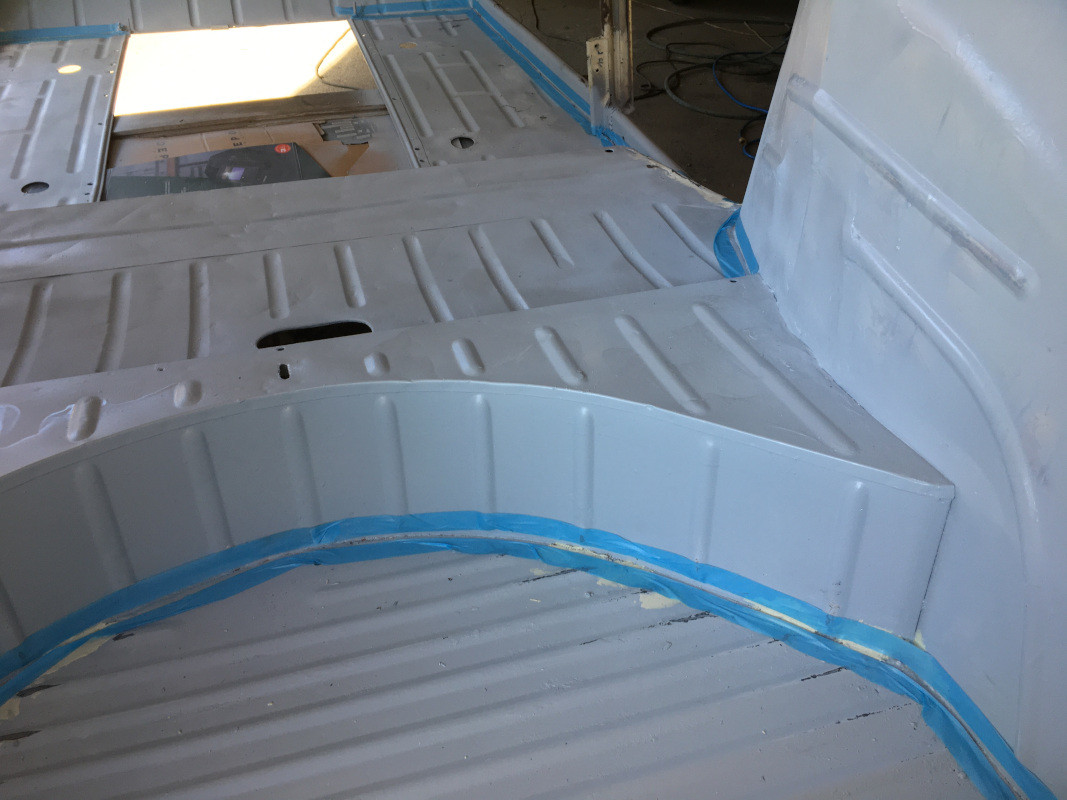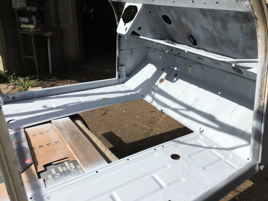 J'ai commencé par passer une petite couche supplémentaire de FEROSE pour mieux stabiliser tout départ de rouille J'ai poncé aussi l'intérieur des passages de roue, et les tôles au-dessus. Il me reste à préparer les planchers Si les températures prévues sont exactes, je passerai, jeudi prochain, la première couche d'apprêt époxy sur les faces intérieures des tôles neuves (planchers), et sans doute, un peu au-dessus.