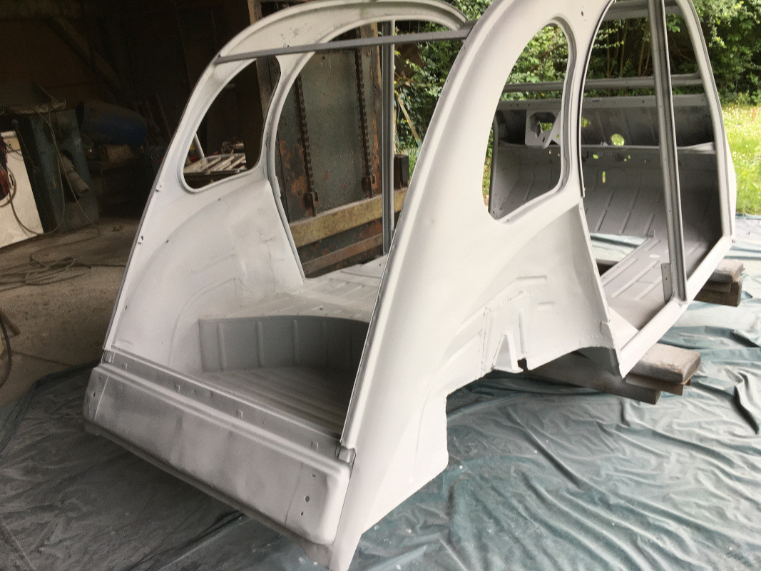 Ce matin, il pleuvait, je n'ai pas pu tondre, j'ai donc travaillé pour terminer le ponçage des éléments de ma 2CV (pare-chocs, barre des phares, volet d'aération, cuvelages des phares...) et de la carrosserie...