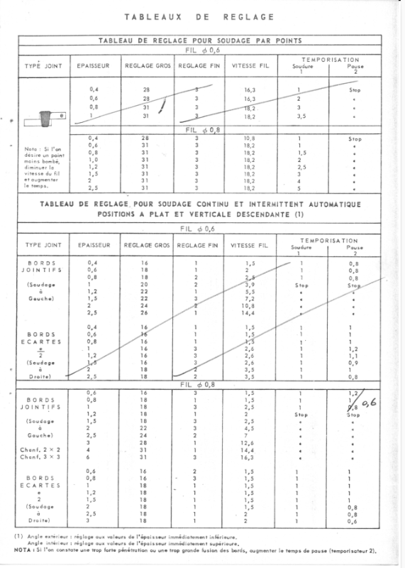 Normalement, pour 1mm d'épaisseur et fil de 0,8mm, tu devrais bien etre dans les 16-18V, et pas loin de 50A / 3-4m par minute...je vérifierai lundi au besoin.