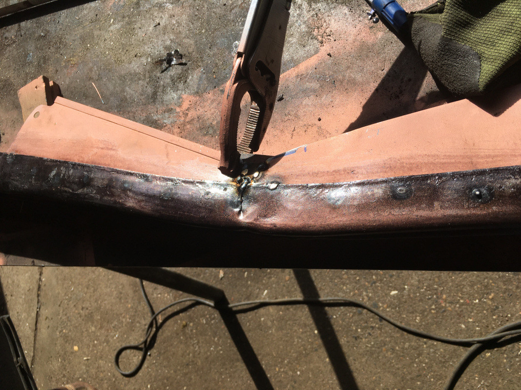 J'ai donc soudé les tôles du pare-chocs mais en employant des tôles neuves, d'une épaisseur de 1,5 mm qui serviront de support du capot fermé.