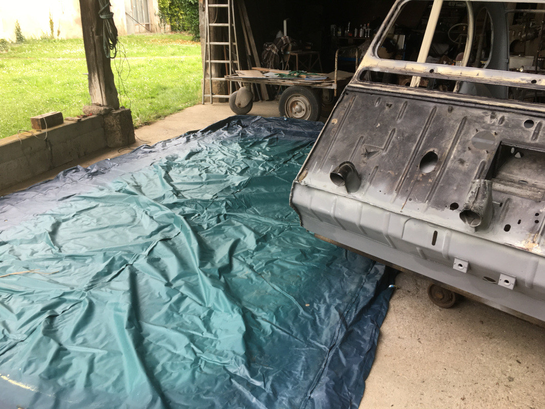 Ce matin, il pleuvait, je n'ai pas pu tondre, j'ai donc travaillé pour terminer le ponçage des éléments de ma 2CV (pare-chocs, barre des phares, volet d'aération, cuvelages des phares...) et de la carrosserie...
