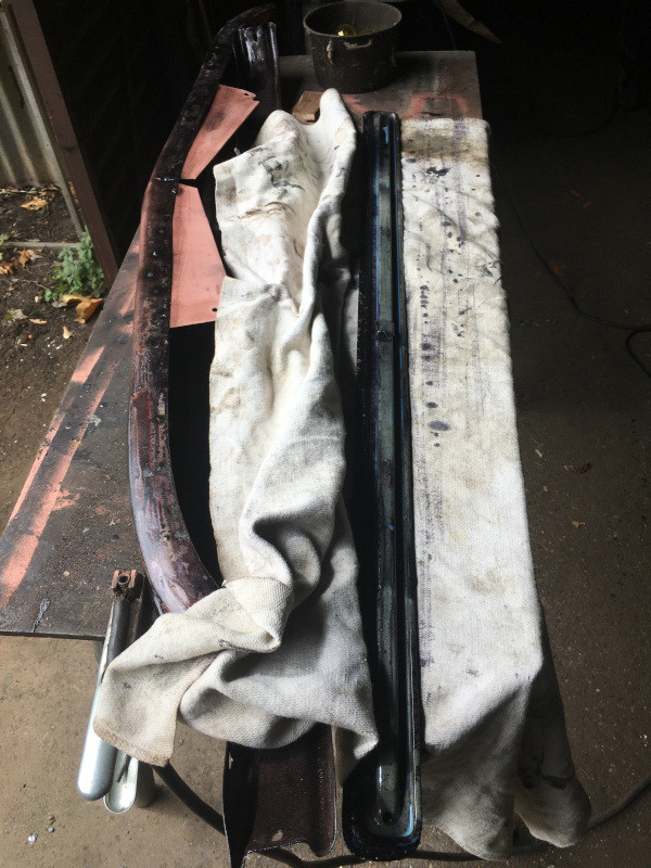 Soudure au MAG avec plaque de cuivre sous la tôle pour mieux répartir la chaleur : Réparation d'un support de pare-chocs avant : Les supports, passés sous FEROSE, qui auront le temps de sécher avant la prochaine séance... Le volet d'auvent, mastiqué et poncé : Je reconnais que je suis parti sur la même logique que pour d'autres éléments : le moins de neuf possible, pour rester ainsi dans la "note" de l'accastillage alentours...