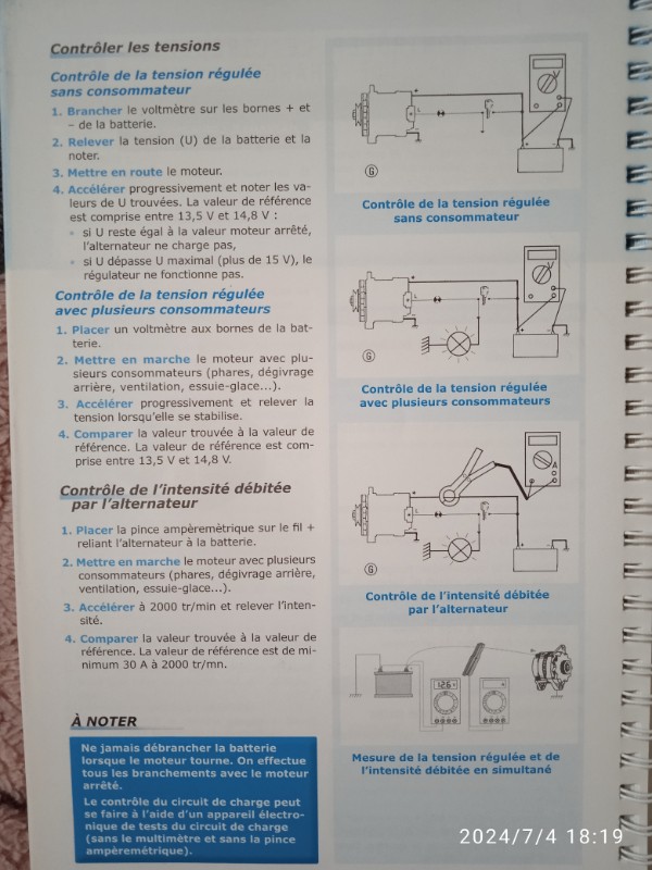 Je ne pense pas que la batterie charge vu que l’aiguille du tableau de bord ne bouge que très peu. Je testerai dans l’après midi. Concrètement si je vois que je n’ai pas la bonne tension que dois je faire pour la suite ? Pour moi si je ne dis pas de bêtise si le régulateur est HS il reste bloquer en position fermée et le courant ne passe pas donc l’alternateur tourne dans le vide sans résistance. Il n’y a aucun moyen de tester l’alternateur en branchant quelque chose dessus comme une lampe pour voir si il arrive à générer du courant ? Merci :)