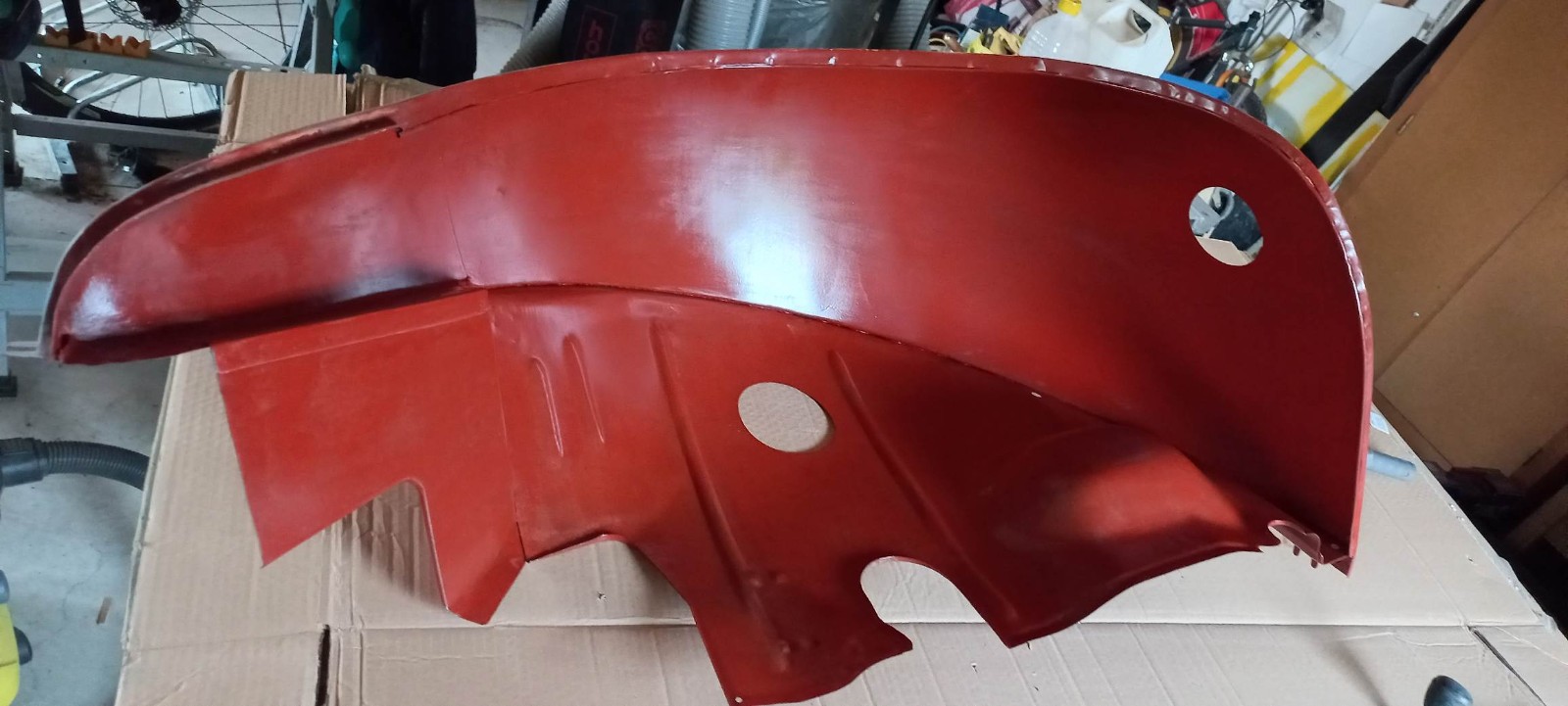 Par contre, j'ai entrepris de refaire l'aile avant G (suite à choc de l'unique précédent proprio, redressé à la masse ou presque) qui était d'origine donc. J'y ai passé... longtemps... sans doute pas loin de 150h pour tout redresser (je ne suis pas carrossier de formation ;o), mais je vous posterai les photos), mais elle est maintenant prête à peindre.