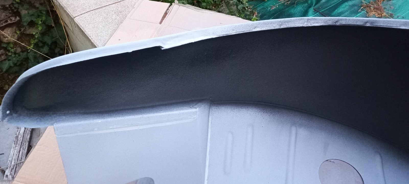 Il me restait un petit fond de peinture, j'en ai profité pour passer cette peinture au pinceau sur le bord intérieur de l'aile pour bien protéger cette zone, qui n'est pas facile d'accès au pistolet...
