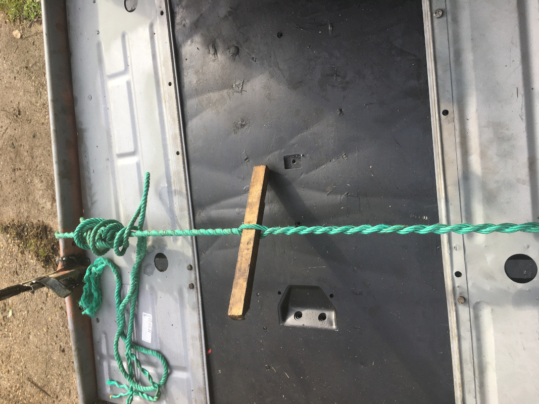 Le fond de coffre est tombé par terre car un tréteau déglingué a basculé, heureusement il est tombé en douceur à plat du bon côté ( comme les chats ).