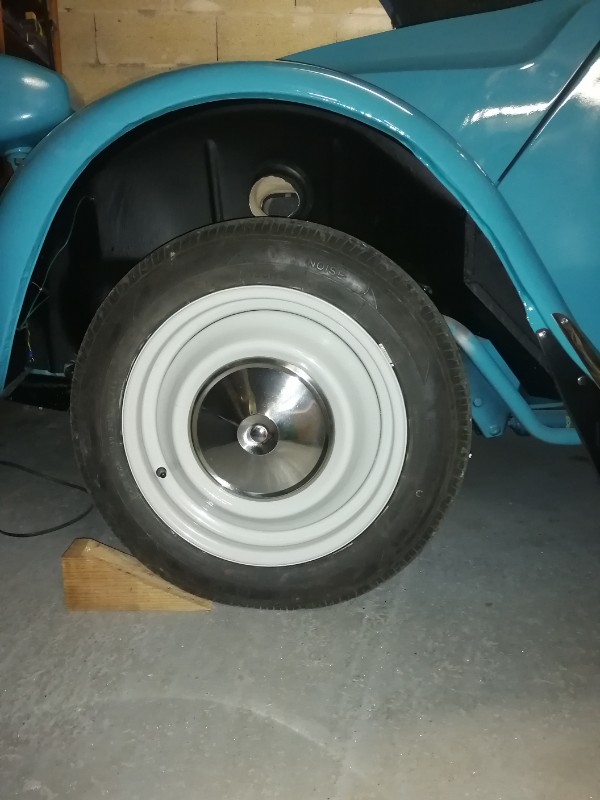 J'ai positionné la caisse à 347 mm du sol, valeur indiquée sur la RTA, à l'aide d'un cric positionné au centre du châssis, mais je trouve que la caisse est bien haute et c'est pas très esthétique, on dirait que la deudeuche lève sa jupe (arrière) : C'est peut être parce que je ne suis pas habitué à en voir ?