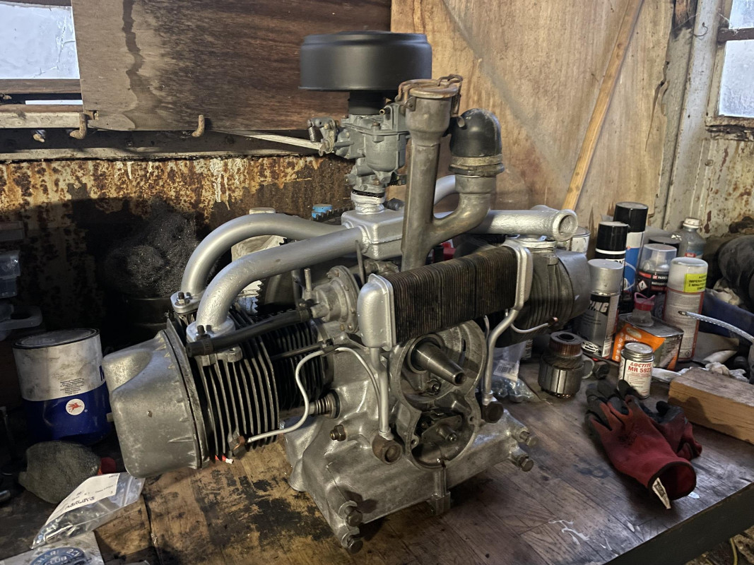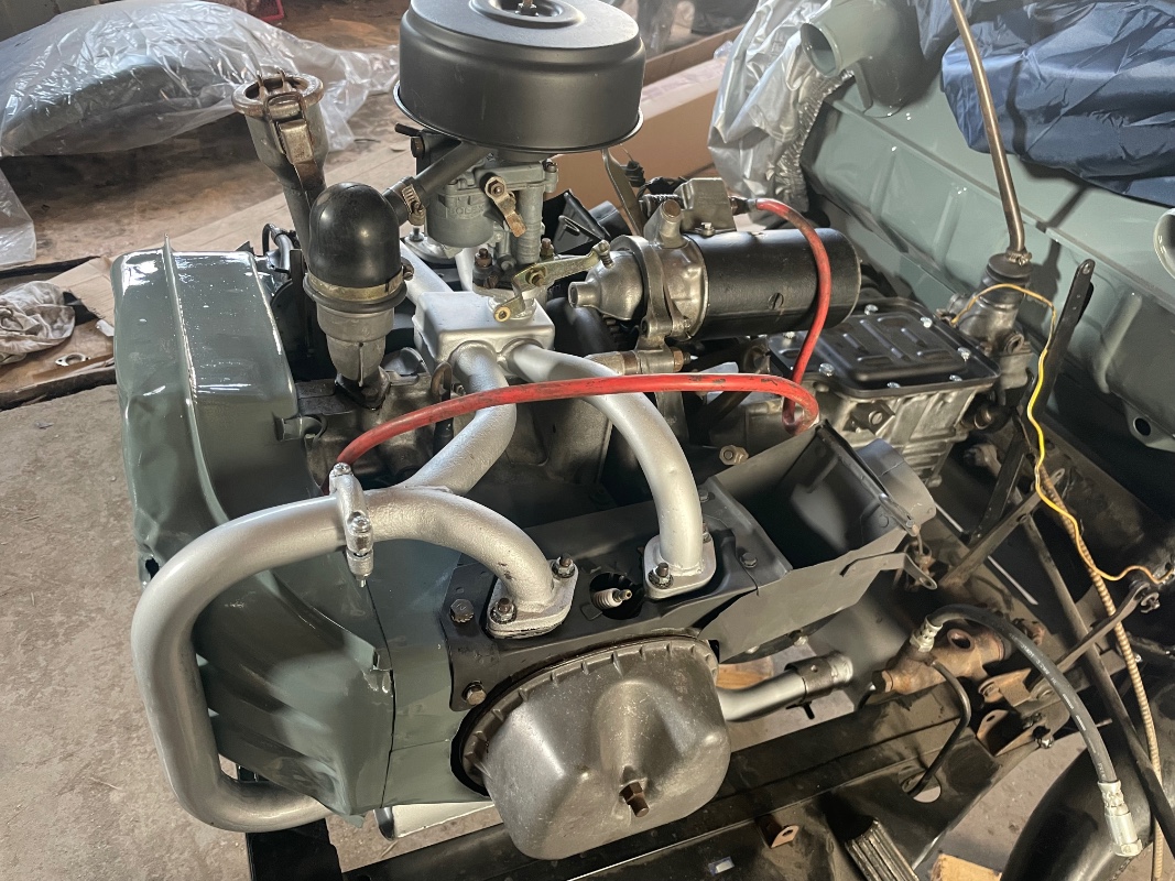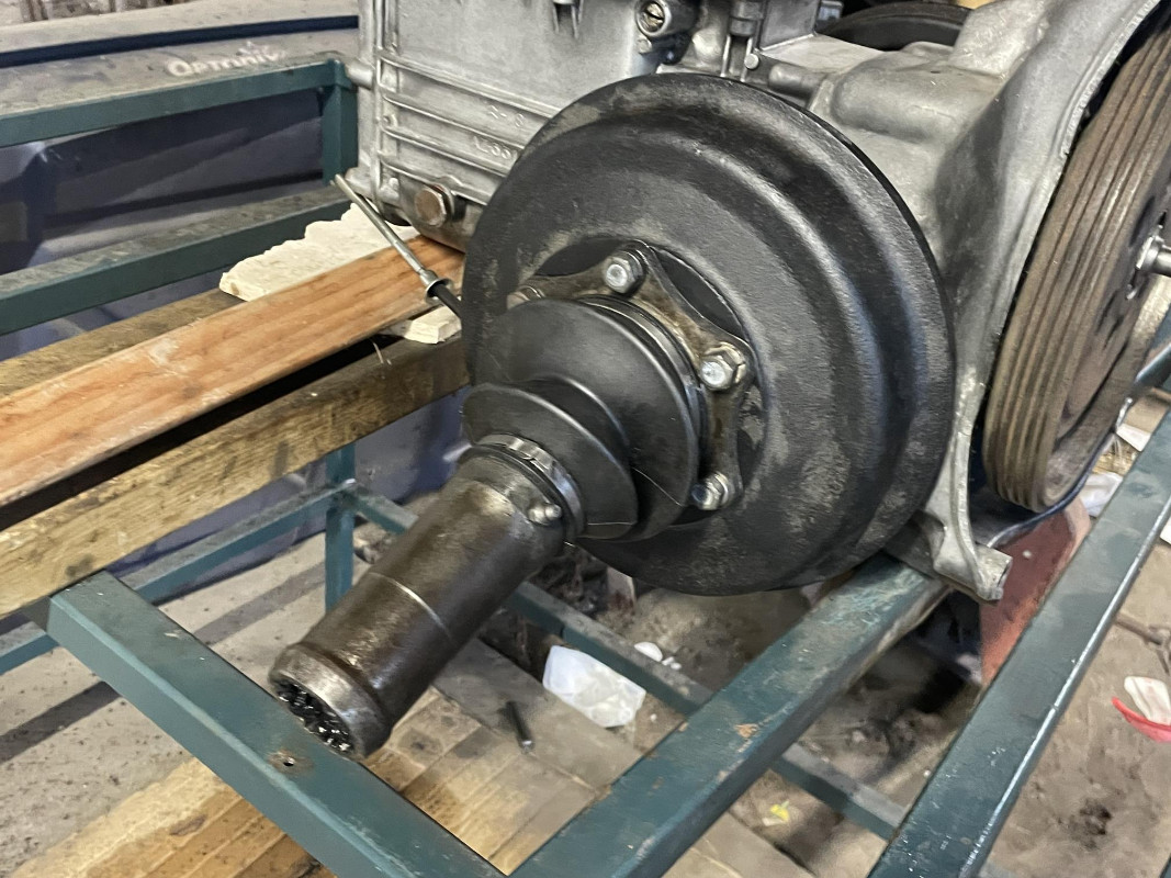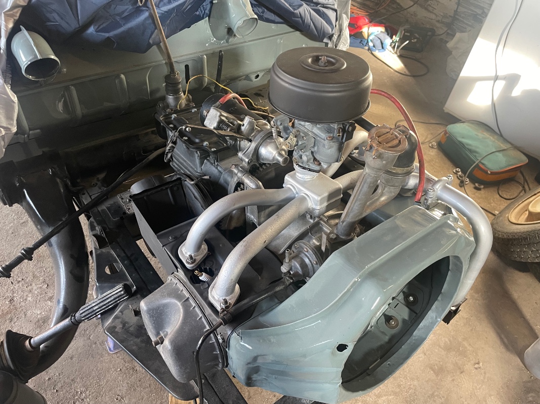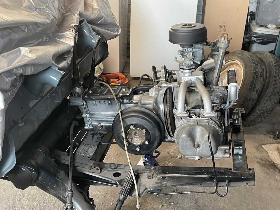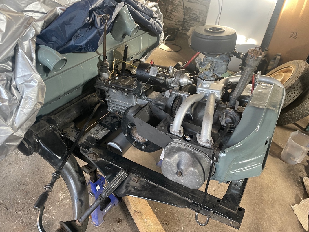 3 - Fait un peu de peinture évidemment 4 - Remis en état les cardans en sortie de boîte et raccrocher le moteur à la boîte. Je me suis dit que je remettrai les toles de circulation d'air et les pots après mais...