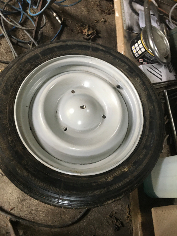 Désolé pour la piètre qualité de la photo. Bien sûr, il me reste à mastiquer les liaisons des tôles et à repeindre l'ensemble : Ensuite, j'ai choisi le moins pire des anciens pneus pour en faire une roue de rechange.