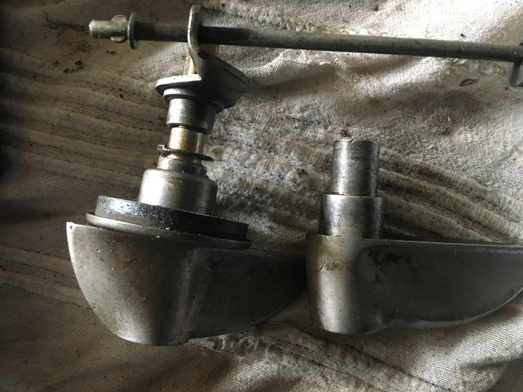 J'ai remplacé la broche, le barillet (stock ancien de mon père, pièces d'origine), mais la partie ronde de la broche semble trop longue, la poignée ne peut entrer à moins 2 cm de la tôle de la porte. Il n'y a qu'un type de broche référencée : celle dont le carré a une longueur de 30 mm. Mais ce n'est pas ce qui gêne, c'est sur la partie ronde de la broche.. Voici les forces en présence : Il y a deux types de poignées, celle de l'AZAM est à droite. On voit bien que la partie ronde de la poignée est plus longue J'ai bien monté le levier de renvoi n° AZ 861-60 avec son côté le plus large, côté poignée, comme sur la photo précédente. Et bien sûr, je n'ai pas oublié la cale sous la serrure.