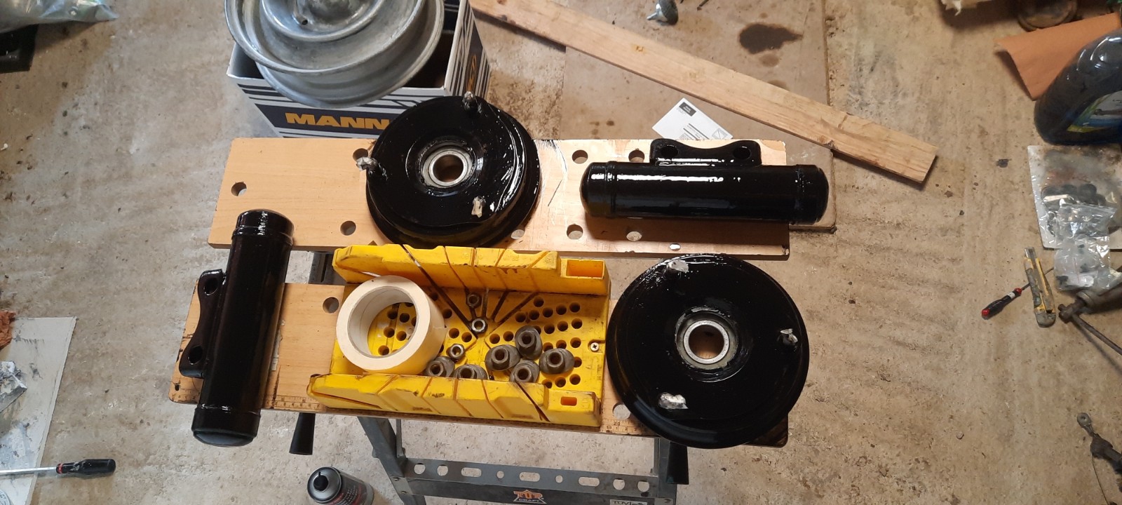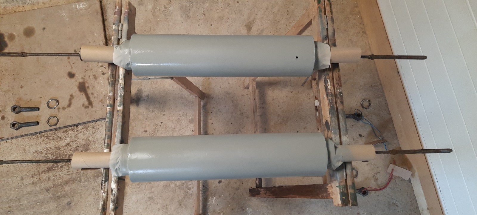 Voilà les pots de suspension apprêtés et peints, j'ai dû reboucher des petits trous sur le cylindre avec du mastic métal car de l'huile s'en échappait. Tous les filets ont été nettoyés