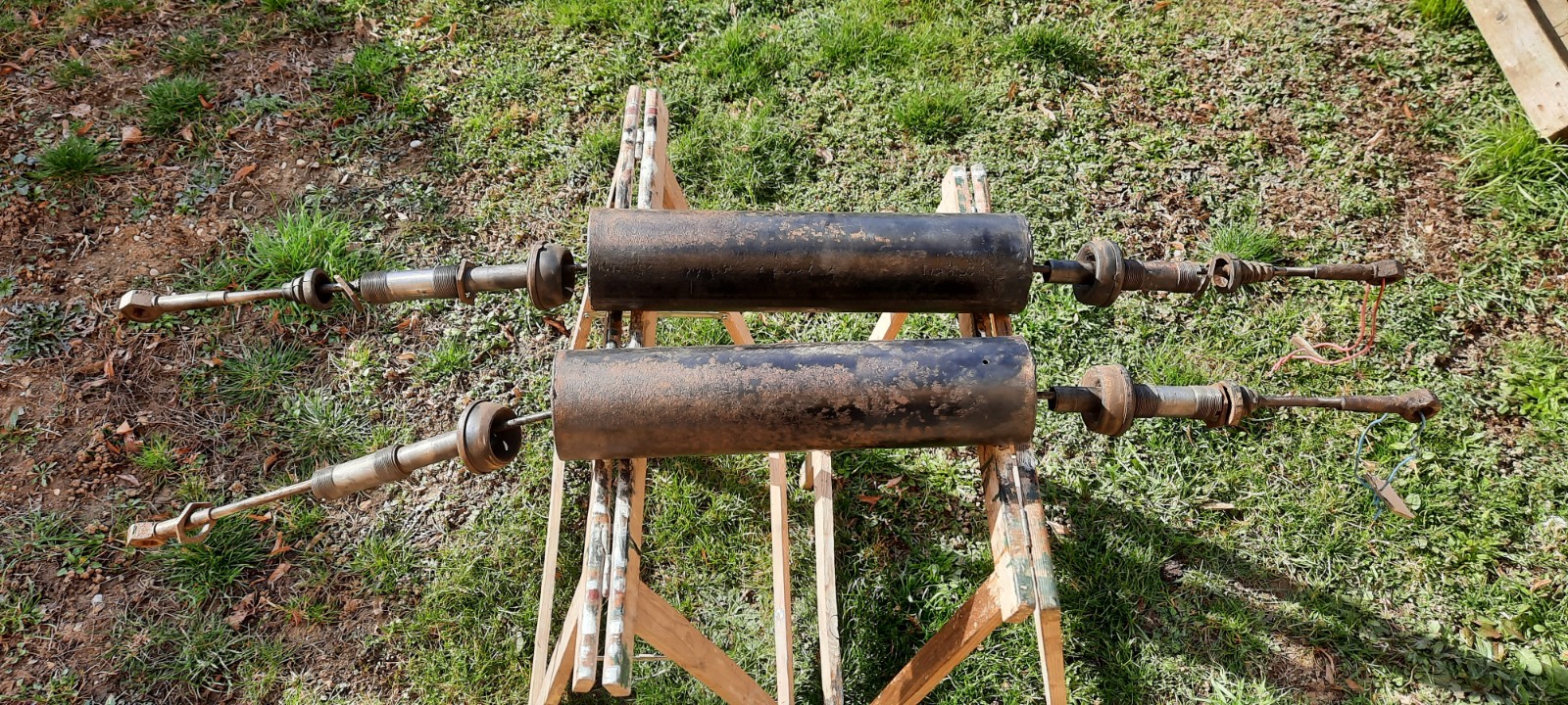 Voilà les pots de suspension apprêtés et peints, j'ai dû reboucher des petits trous sur le cylindre avec du mastic métal car de l'huile s'en échappait. Tous les filets ont été nettoyés
