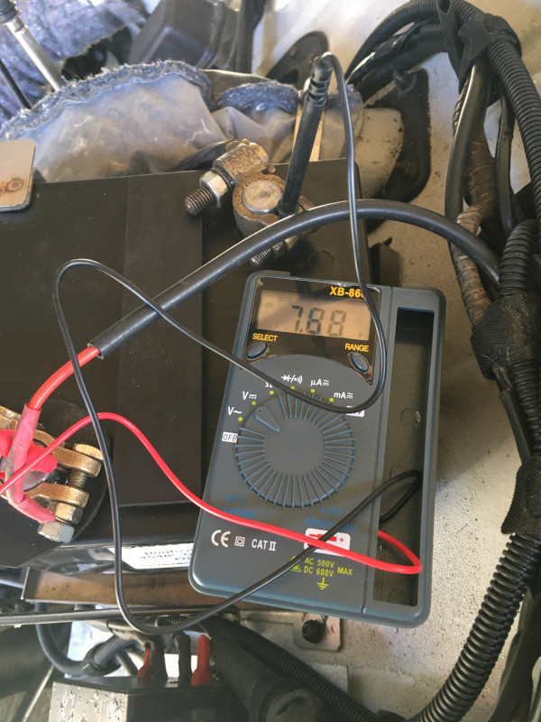 Vue de l'arrière : La sellerie en place : Ensuite, j'ai contrôlé de nouveau la tension de la batterie. Cette fois, pour un affichage plus pratique, j'ai employé un voltmètre numérique (alors que je suis plutôt analogique, d'habitude