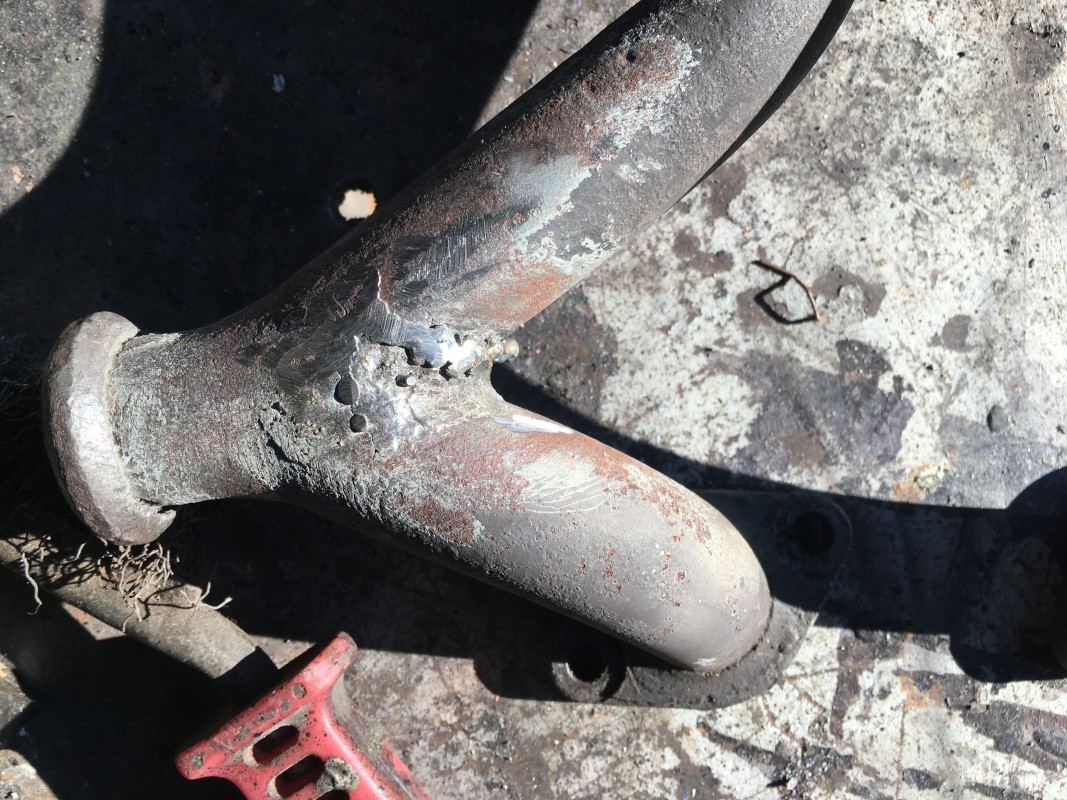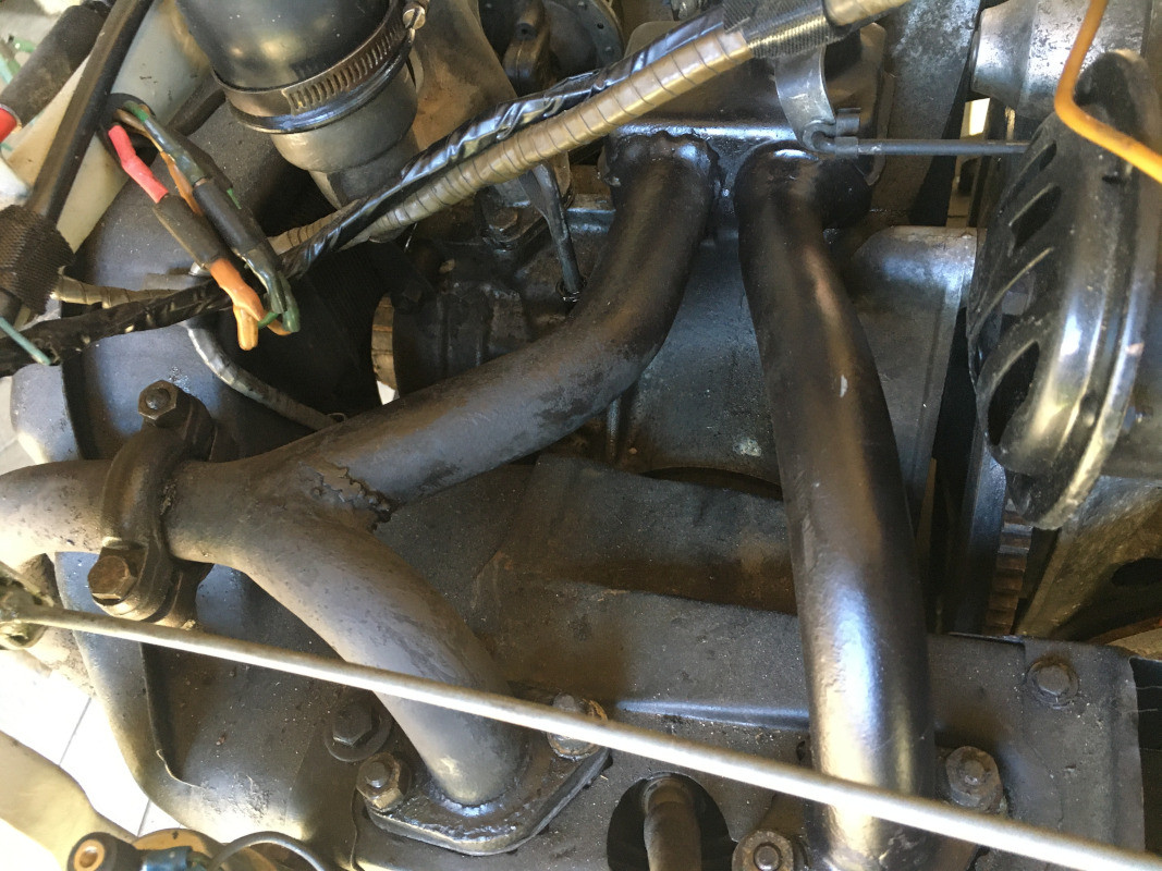 Bon, encore du travail en perspective, la tubulure d'échappement est fendue ! Cette fissure est apparue après l'échauffement de la tubulure, malgré le serrage de ses écrous au couple...