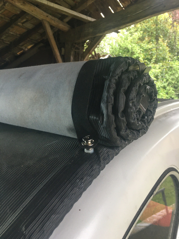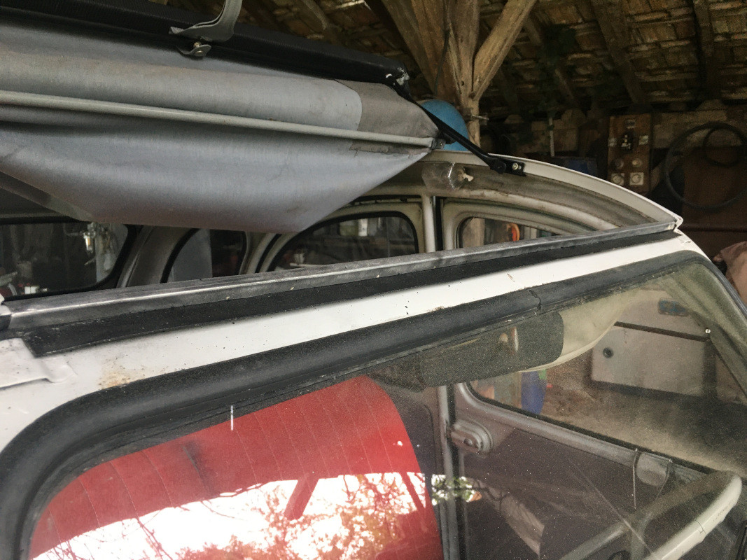 J'ai posé d'abord les arrière en intercalant des cales en plastique, enduites de graisse "marine" : Cela m'a permis ensuite de positionner les pressions intérieures : Et enfin de poser "l'ombrette" ou "tendelet" ou "voile d'ombrage" à l'intérieur : Le rendu, capote ouverte, est plutôt sympathique : A l'intérieur, il "habille" le toit