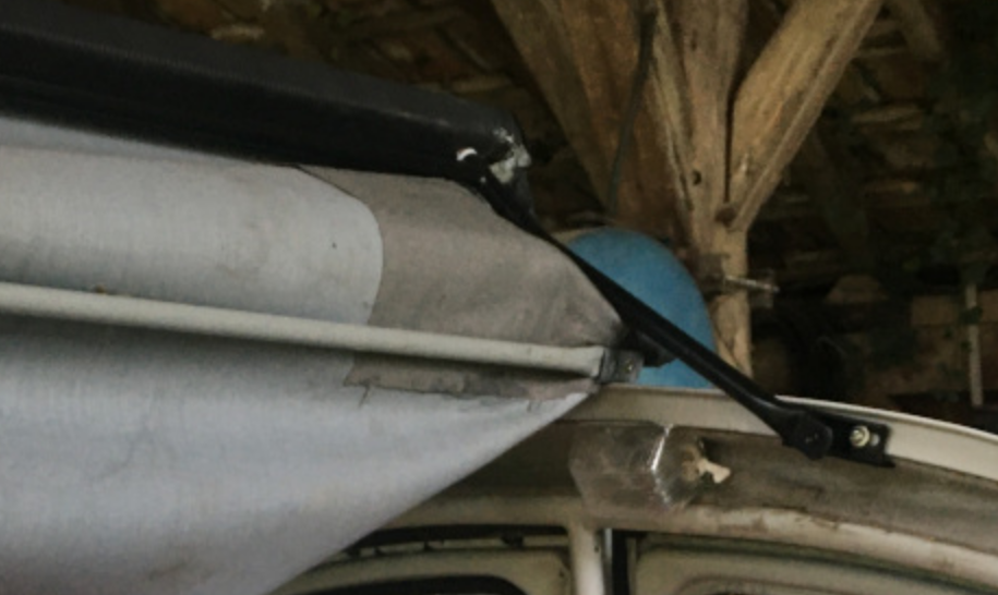 le surplus de toile (entourée en bleu) doit être replié vers l'arrière, à plat. Sympa le tendelet, même si je me suis toujours demandé l'intérêt réel de cet accessoire ! Si c'est pour avoir de l'ombre, autant laisser la capote (pour la protection de la boite crânienne, une casquette sera utile et permettra aussi de gérer les cheveux récalcitrants) et pour l'air, on ouvre le volet d'aération et les fenêtres (d'accord, l'ouverture entière de la capote est plus efficace) ! Mais je suis d'accord, ça donne un petit cachet supplémentaire, un petit truc en plus !