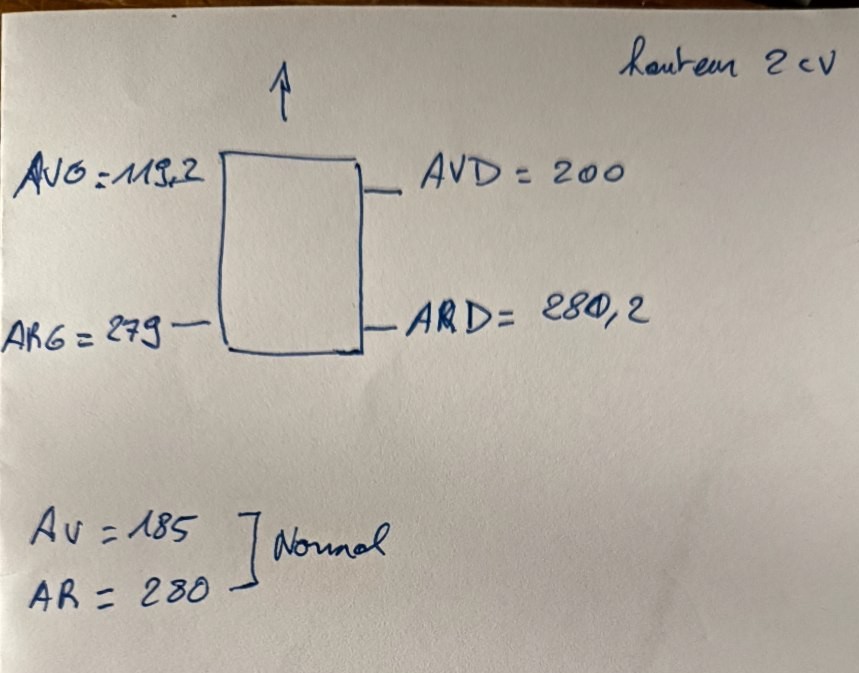 Essaie de les corriger, mais à l'avant gauche, je parierais qu'il y a un affaissement anormal : vérifie s'il n'y a pas de pliure sur le côté de la plateforme, au niveau de la fixation de l'essieu avant.