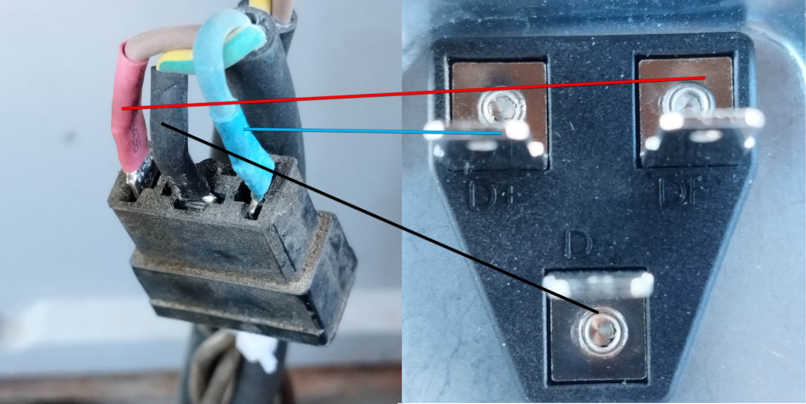 Je suis parti de la prise du régulateur DUCELLIER et j'ai tiré des câbles avec cosses et gaine thermorétractable. Les branchements sur le nouveau régulateur étant tournés dessous, ce schéma permet de mieux voir quel fil va où :