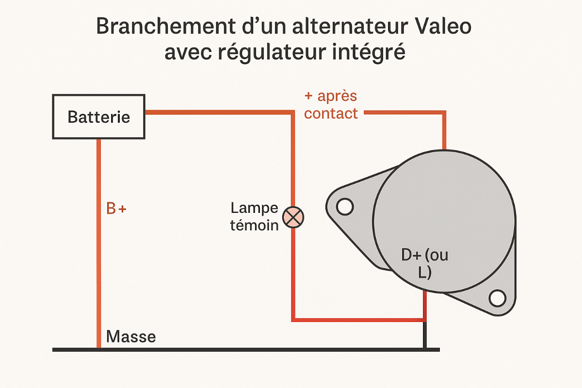 Après inspection et recherche, je découvre que le régulateur est intégré à l’alternateur. Cependant, un régulateur externe est toujours présent, mais seulement le + et la masse sont connectés — l’excitation n’est pas connectée a l'alternateur.