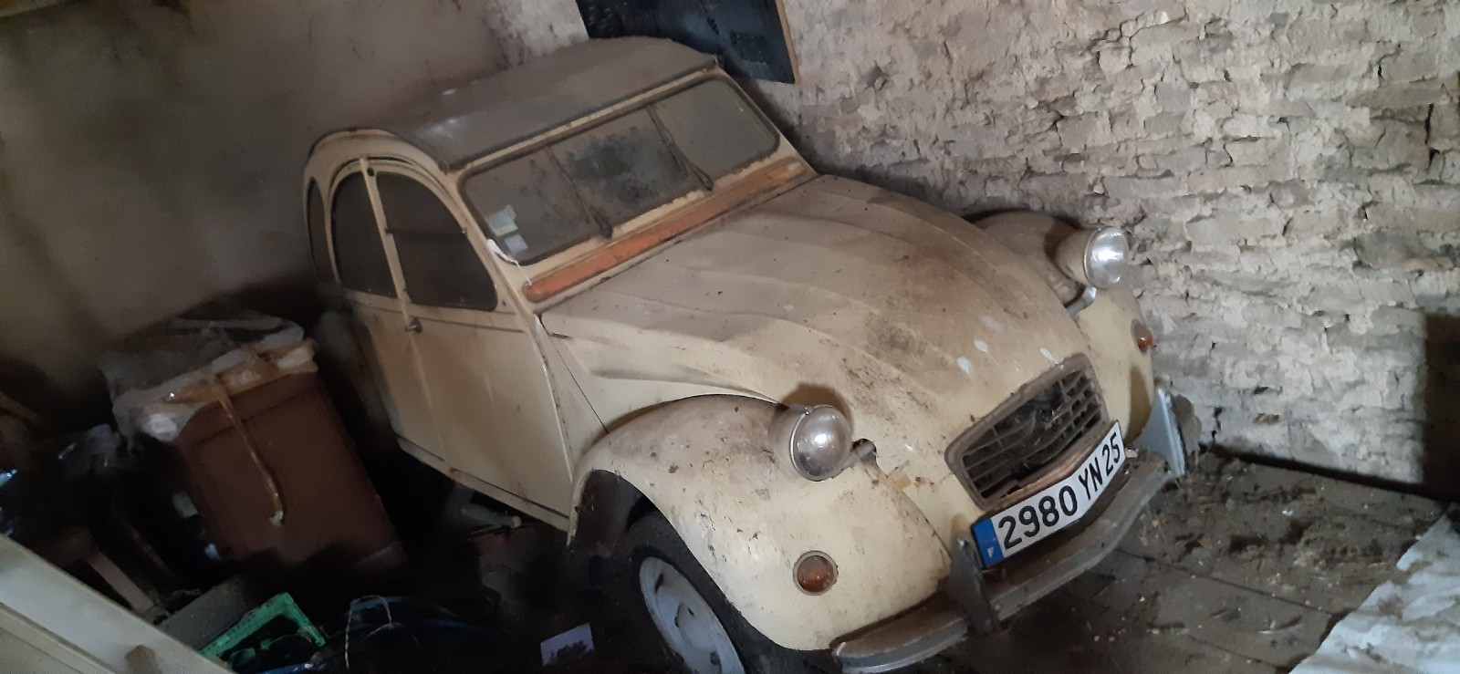 M'emenant voir la voiture, elle est stocké dans une grange en pente, un bourrelet en ciment a été réalisé pour qu'elle puisse être stockée sans mettre ni vitesse, ni frein à main... je n'en revient pas mes yeux, je suis devant un véhicule qui a à peine plus de 10000km d'origine !!!