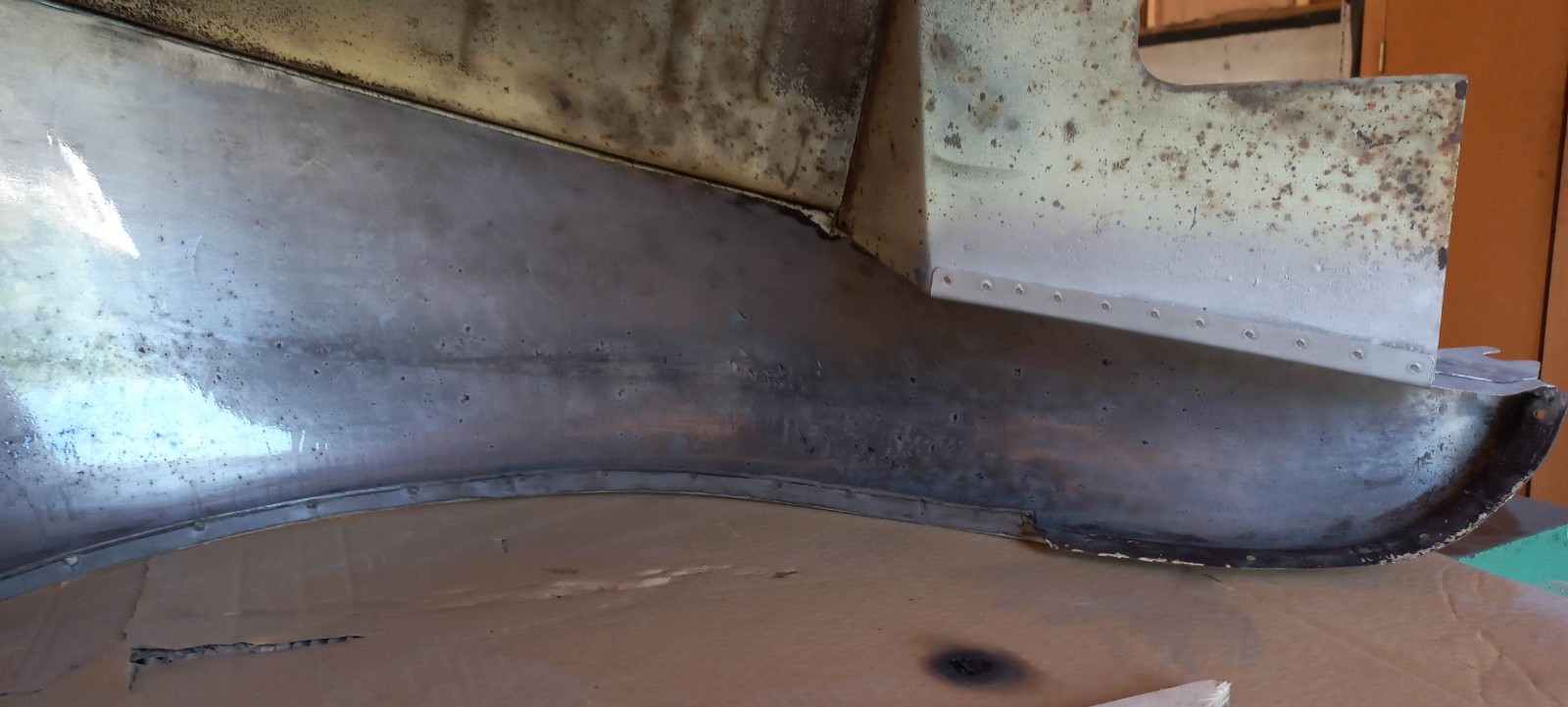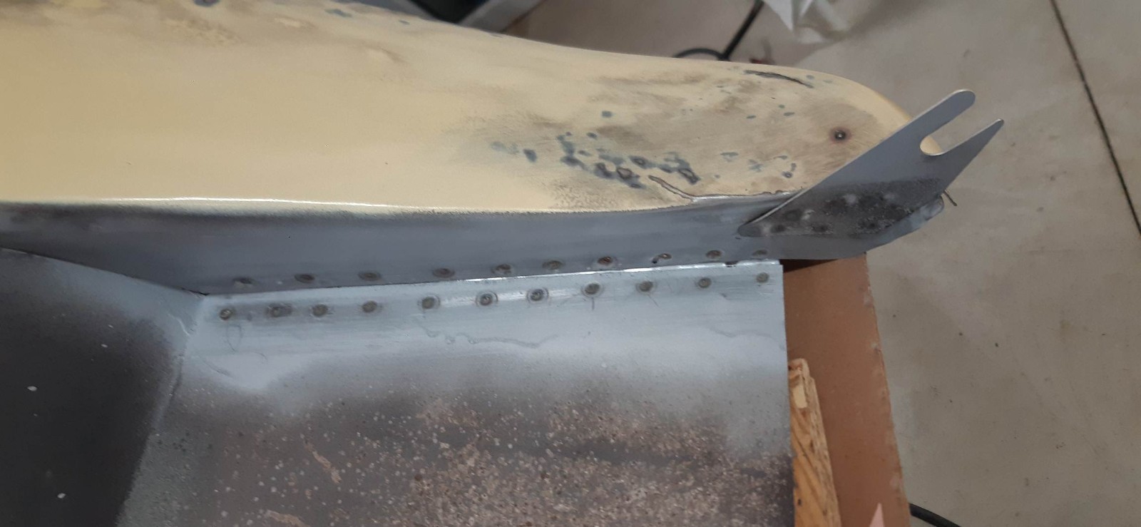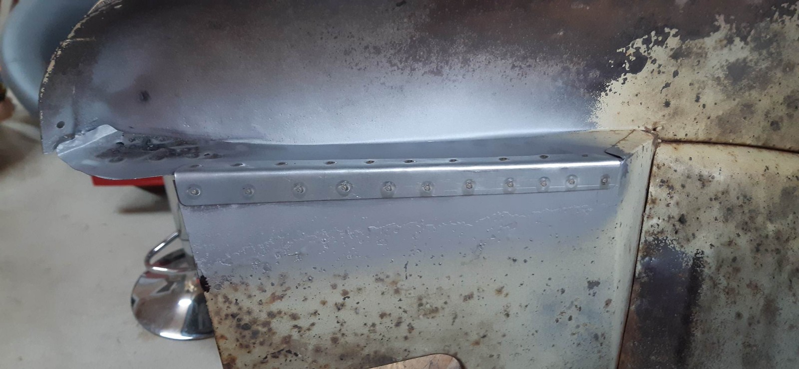 En prime, y'avait un peu de corrosion : Sablage, on coupe ce qui est mort, nouvelle cornière, apprêt Zinc, soudure par points...