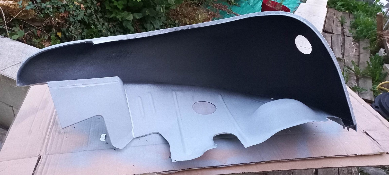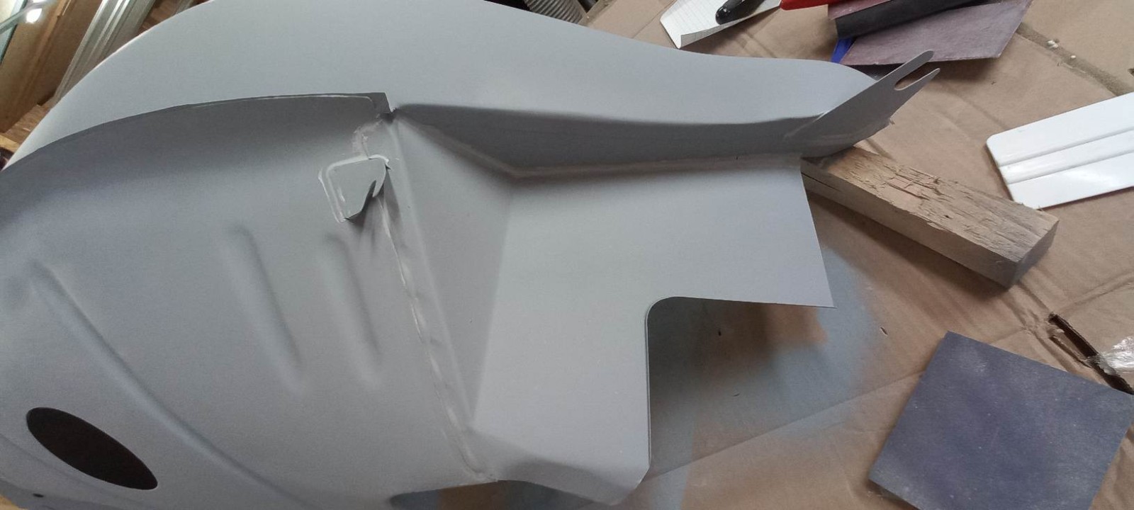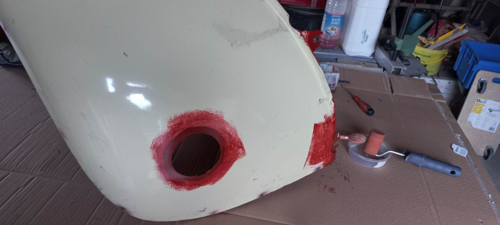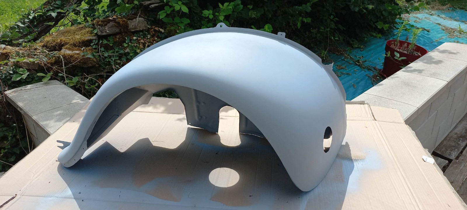 Il me restait un petit fond de peinture, j'en ai profité pour passer cette peinture au pinceau sur le bord intérieur de l'aile pour bien protéger cette zone, qui n'est pas facile d'accès au pistolet...