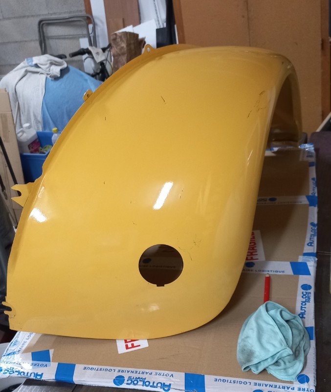 Par contre, j'ai entrepris de refaire l'aile avant G (suite à choc de l'unique précédent proprio, redressé à la masse ou presque) qui était d'origine donc. J'y ai passé... longtemps... sans doute pas loin de 150h pour tout redresser (je ne suis pas carrossier de formation ;o), mais je vous posterai les photos), mais elle est maintenant prête à peindre.