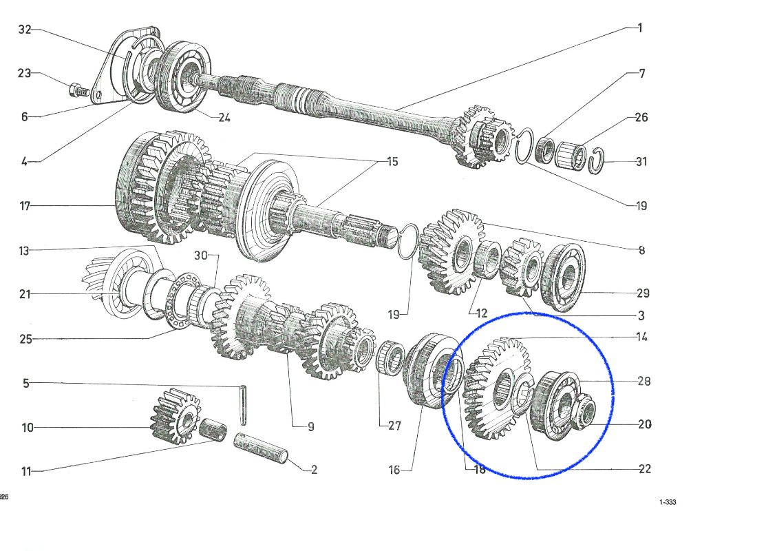 D'ailleurs, quand on serre cet écrou, celui de l'axe du pignon conique et que je regarde le plan de boite sur la revue technique, je ne vois pas très bien contre quoi cet écrou vient plaquer la bague intérieur du roulement associé. Je ne vois pas d'épaulement et vu le nombre de pignons qui sont sensé tourner librement sur cet axe, je ne vois pas comment cet épaulement peut être le pignon conique lui même vu qu'il est situé à l'autre bout de l'arbre, si quelqu'un peut m'éclairer ...