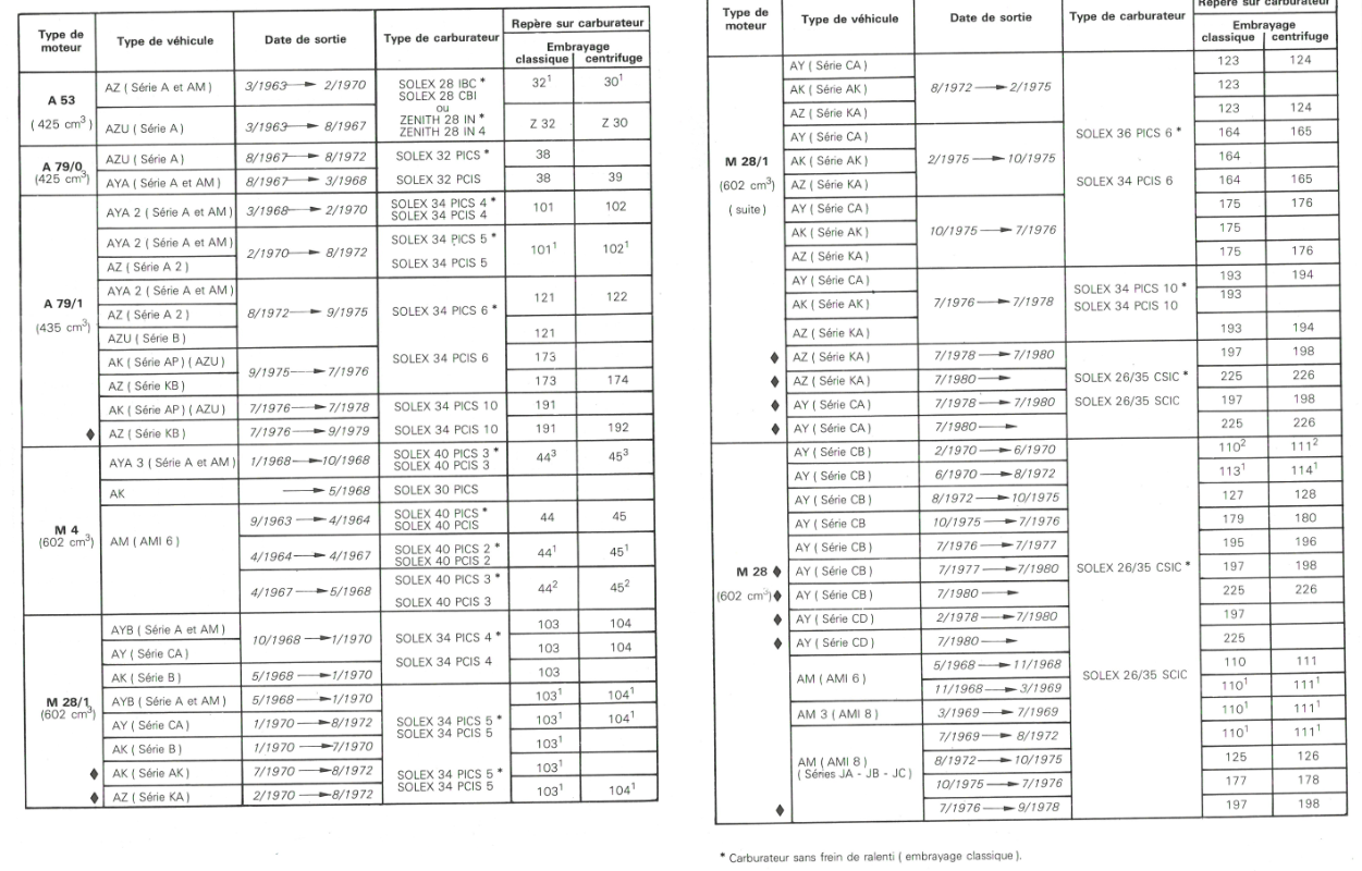 Ce sont soit des SOLEX 28 CBI ou des ZENITH 28 IN 4 Cela dit, ces carburateurs fonctionnent aussi sur les moteurs équipés de l'embrayage classique...
