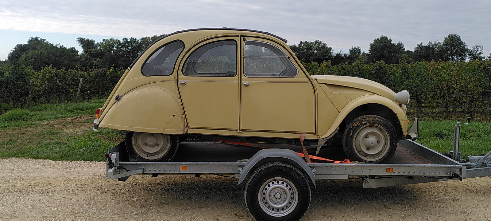 Également, j'avais naguère une Méhari, mais qui a hélas été accidentée au niveau épave; elle a été reconvertie en buggy, en mettant ce qui était récupérable (ensemble motopropulseur et suspensions) sur un châssis d'une autre épave de 2CV. Elle est chez un autre ami, qui fait de temps en temps le foufou dans les vignes avec.