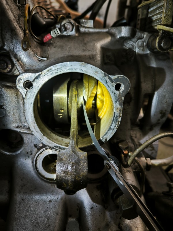 Dépose du cylindre gauche sans problème me permettant de constater que tout semble ok côté bas moteur, du moins que le moteur semble tourner normalement dans les deux sens sauf que...