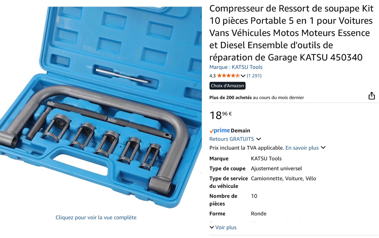 Et décrouté la calamine collée derrière les têtes des soupapes, et bien tout remis en place. Là pour le coup, vu la puissance des ressorts, obligé d'avoir un lève soupape. J'en ai acheté un merdique sur amazon, ça a fait l'affaire vu que je ne compte pas l'utiliser souvent , mais il s'est retrouvé tordu à la fin des opérations et ne rentrait plus dans sa boite.. . Je l'ai redressé à coup de masse. N'achetez donc pas ce modèle :