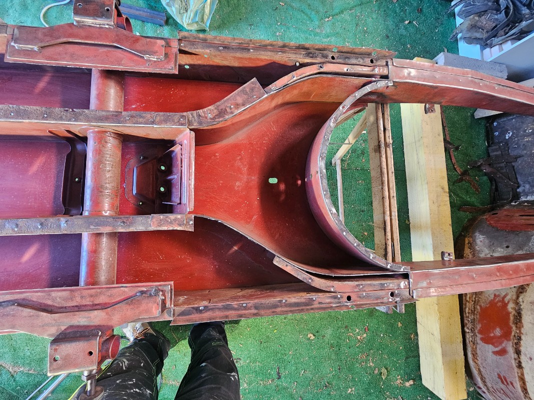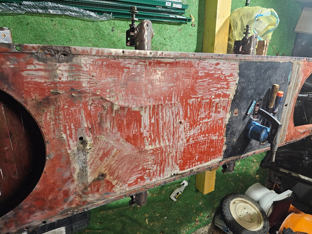 Toutes les soudures ont été dépointé avec un foret métaux de 12mm, séparation des tôles avec tournevis puis burin plat et large, tout bien décaper, j ai mis de la peinture haemerite dans tout l intérieur du châssis, après avoir traité tout à la ferose. Après tout ressoudé, par bouchonnage au poste a souder mig, fil 0.8 + gaz argon.