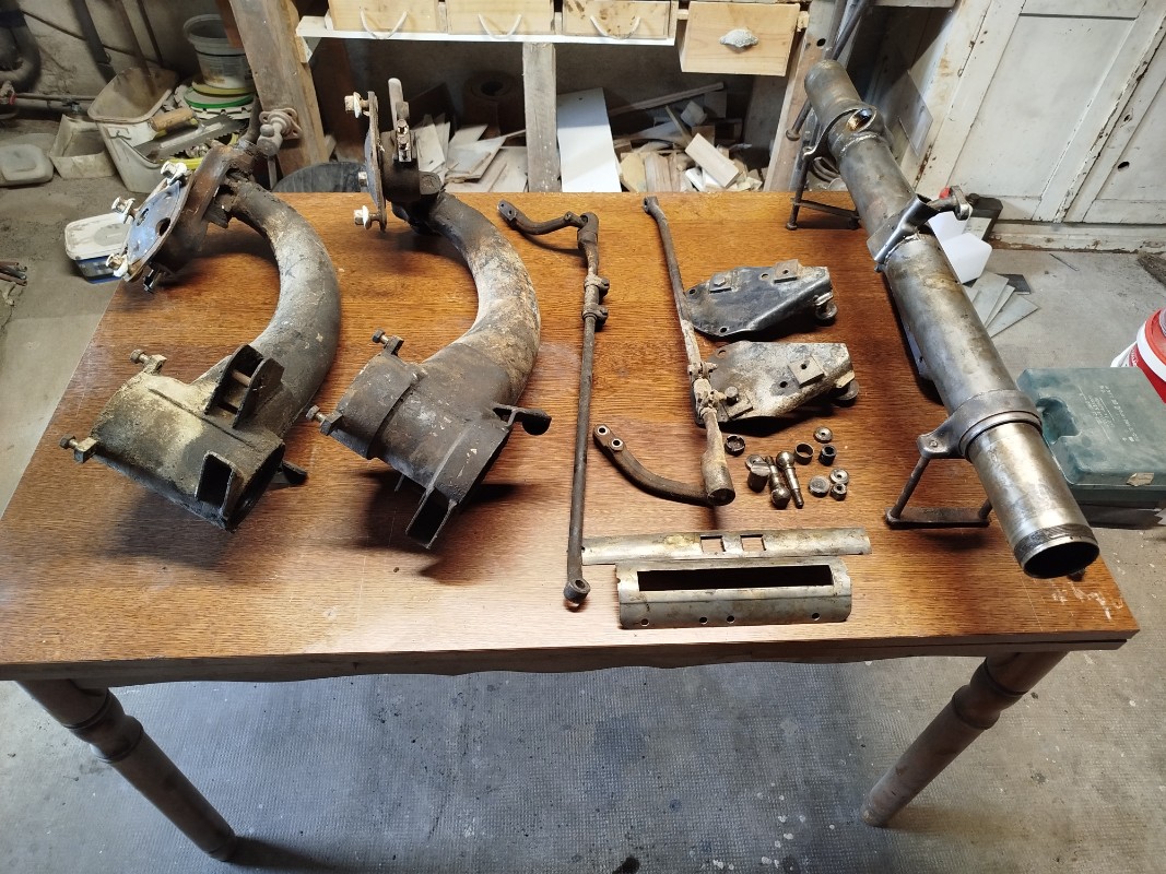 Bonjour à tous, le train arrière est prêt à peindre, aujourd'hui j'ai attaqué le train avant, c'était pas la même. Démontage des 2 bras,des barres de direction et de la crémaillère, c'était un peu compliqué mais avec l'aide du forum et quelques vidéos j'y suis arrivé. Demain je termine le nettoyage et normalement lundi je peins,la température est revenue dans le positif. Photo jointe du train avant démonté et partiellement nettoyé. Bonne soirée à vous.