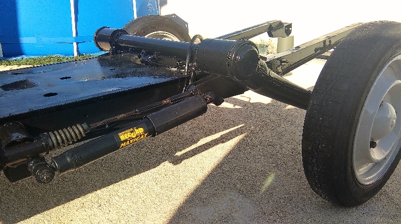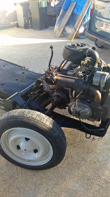 le chassis était très bon !...du coup brossage, antirouille, peinture,moi qui voulait en mettre un galva !...mais bon du coup budget meilleur ! ( bientôt une cire corps creux dans le chassis verra le jour ), changement des 4 amortisseurs et de tous les soufflets